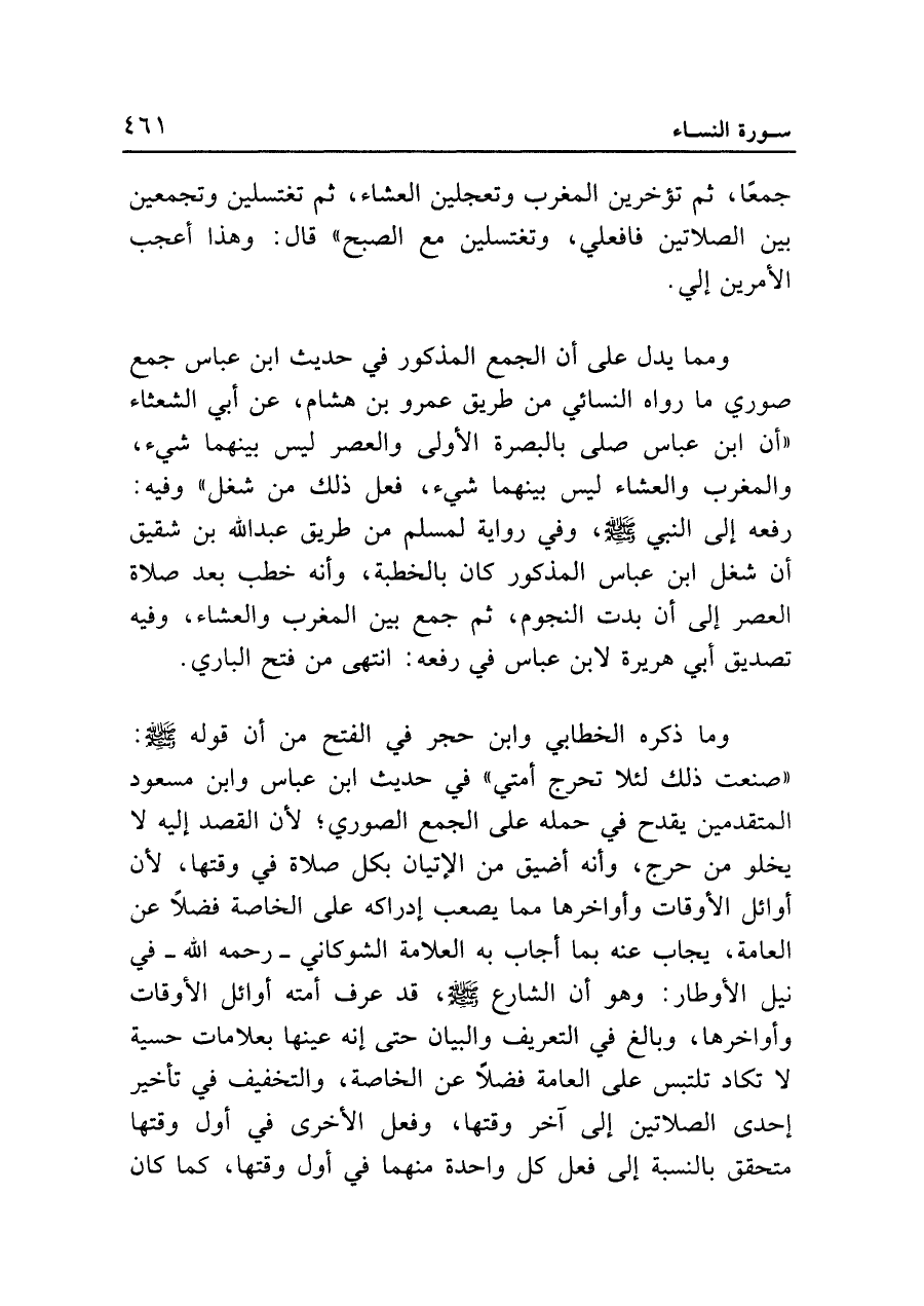 وما ذكره الخطابي وابن حجر في الفتح من أن قوله - صلى الله عليه وسلم -: "صنعت ذلك لئلا تحرج أمتي" في حديث ابن عباس وابن مسعود المتقدمين يقدح في حمله على الجمع الصوري؛ لأن القصد إليه لا يخلو من حرج، وأنه أضيق من الإتيان بكل صلاة في وقتها، لأن أوائل الأوقات وأواخرها مما يصعب إدراكه على الخاصة فضلا عن العامة، يجاب عنه بما أجاب به العلامة الشوكاني -رحمه الله- في نيل الأوطار: وهو أن الشارع - صلى الله عليه وسلم -، قد عرف أمته أوائل الأوقات وأواخرها، وبالغ في التعريف والبيان حتى إنه عينها بعلامات حسية لا تكاد تلتبس على العامة فضلا عن الخاصة، والتخفيف في تأخير إحدى الصلاتين إلى آخر وقتها، وفعل الأخرى في أول وقتها متحقق بالنسبة إلى فعل كل واحدة منهما في أول وقتها، كما كان