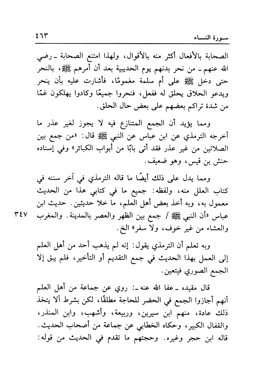 ومما يدل على ذلك أيضا ما قاله الترمذي في آخر سننه في كتاب العلل منه، ولفظه: جميع ما في كتابي هذا من الحديث معمول به، وبه أخذ بعض أهل العلم، ما خلا حديثين. حديث ابن عباس "أن النبي - صلى الله عليه وسلم - جمع بين الظهر والعصر بالمدينة. والمغرب والعشاء من غير خوف، ولا سفر" الخ.