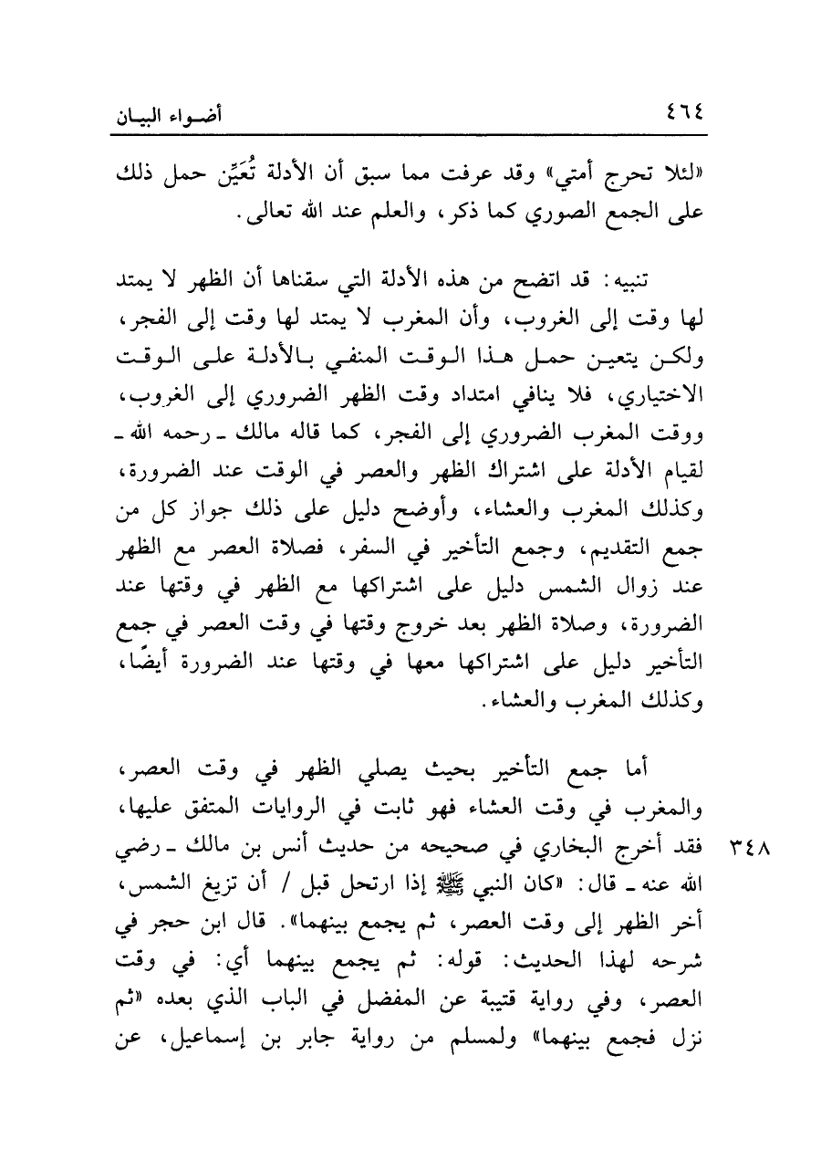 تنبيه: قد اتضح من هذه الأدلة التي سقناها أن الظهر لا يمتد لها وقت إلى الغروب، وأن المغرب لا يمتد لها وقت إلى الفجر، ولكن يتعين حمل هذا الوقت المنفي بالأدلة على الوقت الاختياري، فلا ينافي امتداد وقت الظهر الضروري إلى الغروب، ووقت المغرب الضروري إلى الفجر، كما قاله مالك -رحمه الله- لقيام الأدلة على اشتراك الظهر والعصر في الوقت عند الضرورة، وكذلك المغرب والعشاء، وأوضح دليل على ذلك جواز كل من جمع التقديم، وجمع التأخير في السفر، فصلاة العصر مع الظهر عند زوال الشمس دليل على اشتراكها مع الظهر في وقتها عند الضرورة، وصلاة الظهر بعد خروج وقتها في وقت العصر في جمع التأخير دليل على اشتراكها معها في وقتها عند الضرورة أيضا، وكذلك المغرب والعشاء.