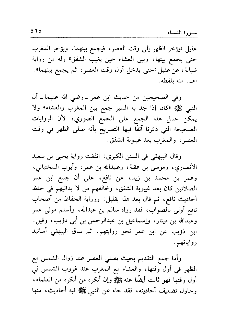 وقال البيهقي في السنن الكبرى: اتفقت رواية يحيى بن سعيد الأنصاري، وموسى بن عقبة، وعبيد الله بن عمر، وأيوب السختياني، وعمر بن محمد بن زيد، عن نافع، على أن جمع ابن عمر الصلاتين كان بعد غيبوبة الشفق، وخالفهم من لا يدانيهم في حفظ أحاديث نافع، ثم قال بعد هذا بقليل: ورواية الحفاظ من أصحاب نافع أولى بالصواب، فقد رواه سالم بن عبد الله، وأسلم مولى عمر وعبد الله بن دينار، وإسماعيل بن عبد الرحمن بن أبي ذؤيب، وقيل: ابن ذؤيب عن ابن عمر نحو روايتهم. ثم ساق البيهقي أسانيد رواياتهم.