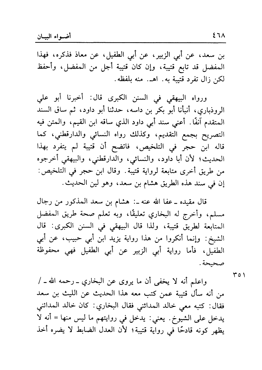 قال مقيده - عفا الله عنه -: هشام بن سعد المذكور من رجال مسلم، وأخرج له البخاري تعليقا، وبه تعلم صحة طريق المفضل المتابعة لطريق قتيبة، ولذا قال البيهقي في السنن الكبرى: قال الشيخ: وإنما أنكروا من هذا رواية يزيد ابن أبي حبيب، عن أبي الطفيل، فأما رواية أبي الزبير عن أبي الطفيل فهي محفوظة صحيحة.