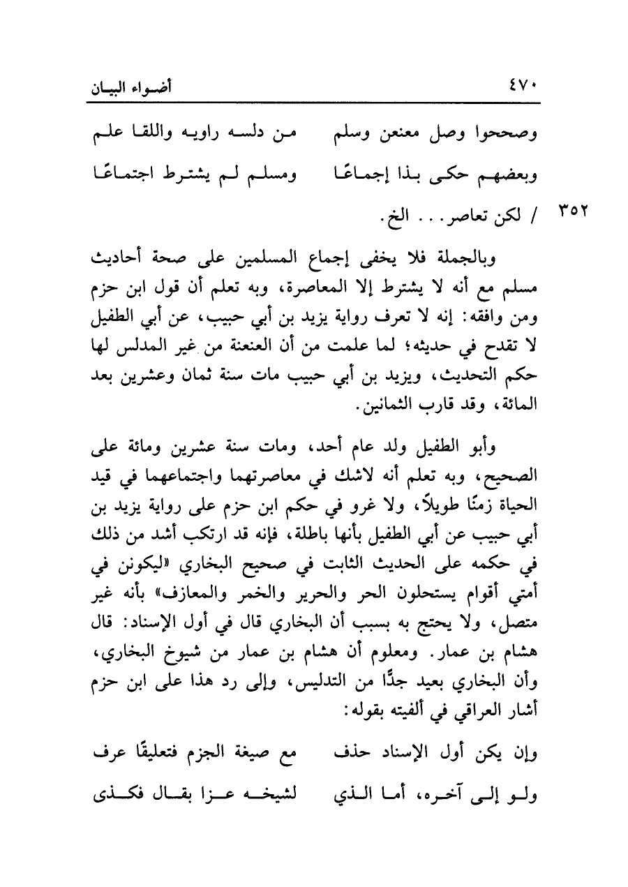 وبالجملة فلا يخفى إجماع المسلمين على صحة أحاديث مسلم مع أنه لا يشترط إلا المعاصرة، وبه تعلم أن قول ابن حزم ومن وافقه: إنه لا تعرف رواية يزيد بن أبي حبيب، عن أبي الطفيل لا تقدح في حديثه؛ لما علمت من أن العنعنة من غير المدلس لها حكم التحديث، ويزيد بن أبي حبيب مات سنة ثمان وعشرين بعد المائة، وقد قارب الثمانين.