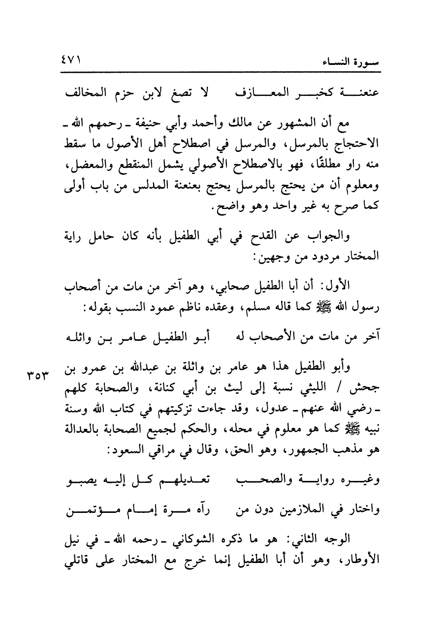 وأبو الطفيل هذا هو عامر بن واثلة بن عبد الله بن عمرو بن جحش الليثي نسبة إلى ليث بن أبي كنانة، والصحابة كلهم -رضي الله عنهم- عدول، وقد جاءت تزكيتهم في كتاب الله وسنة نبيه - صلى الله عليه وسلم - كما هو معلوم في محله، والحكم لجميع الصحابة بالعدالة هو مذهب الجمهور، وهو الحق، وقال في مراقي السعود: