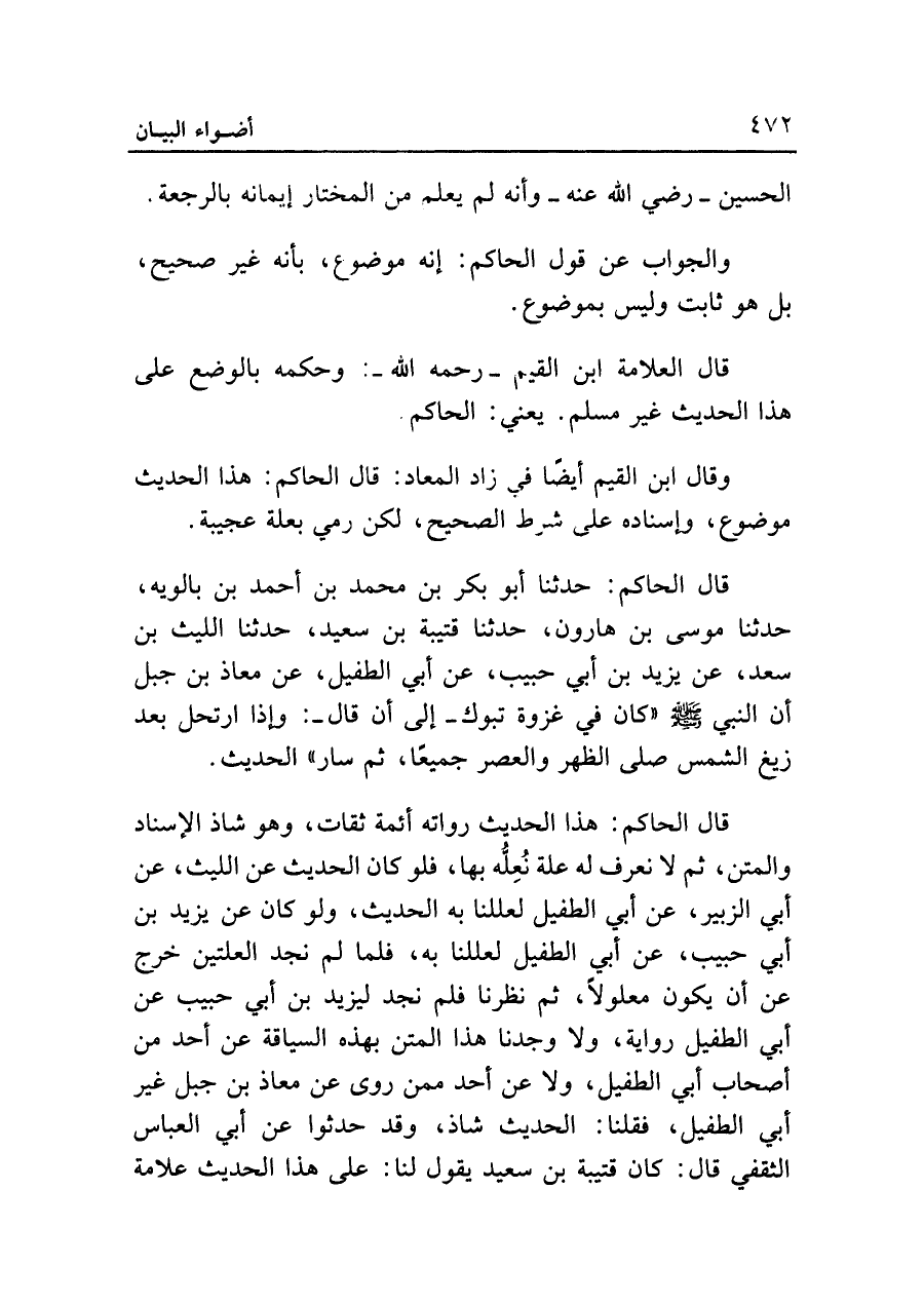 قال الحاكم: هذا الحديث رواته أئمة ثقات، وهو شاذ الإسناد والمتن، ثم لا نعرف له علة نعله بها، فلو كان الحديث عن الليث، عن أبي الزبير، عن أبي الطفيل لعللنا به الحديث، ولو كان عن يزيد بن أبي حبيب، عن أبي الطفيل لعللنا به، فلما لم نجد العلتين خرج عن أن يكون معلولا، ثم نظرنا فلم نجد ليزيد بن أبي حبيب عن أبي الطفيل رواية، ولا وجدنا هذا المتن بهذه السياقة عن أحد من أصحاب أبي الطفيل، ولا عن أحد ممن روى عن معاذ بن جبل غير أبي الطفيل، فقلنا: الحديث شاذ، وقد حدثوا عن أبي العباس الثقفي قال: كان قتيبة بن سعيد يقول لنا: على هذا الحديث علامة