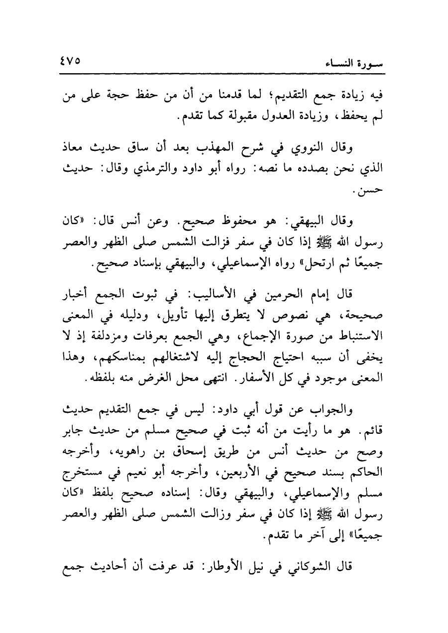 والجواب عن قول أبي داود: ليس في جمع التقديم حديث قائم. هو ما رأيت من أنه ثبت في صحيح مسلم من حديث جابر وصح من حديث أنس من طريق إسحاق بن راهويه، وأخرجه الحاكم بسند صحيح في الأربعين، وأخرجه أبو نعيم في مستخرج مسلم والإسماعيلي، والبيهقي وقال: إسناده صحيح بلفظ "كان رسول الله - صلى الله عليه وسلم - إذا كان في سفر وزالت الشمس صلى الظهر والعصر جميعا" إلى آخر ما تقدم.