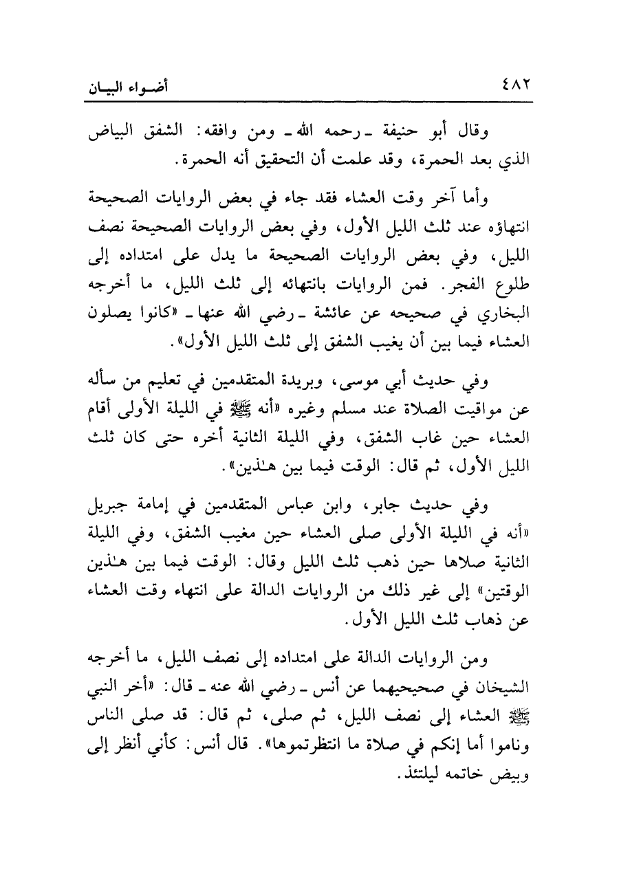 وقال أبو حنيفة -رحمه الله- ومن وافقه: الشفق البياض الذي بعد الحمرة، وقد علمت أن التحقيق أنه الحمرة.
