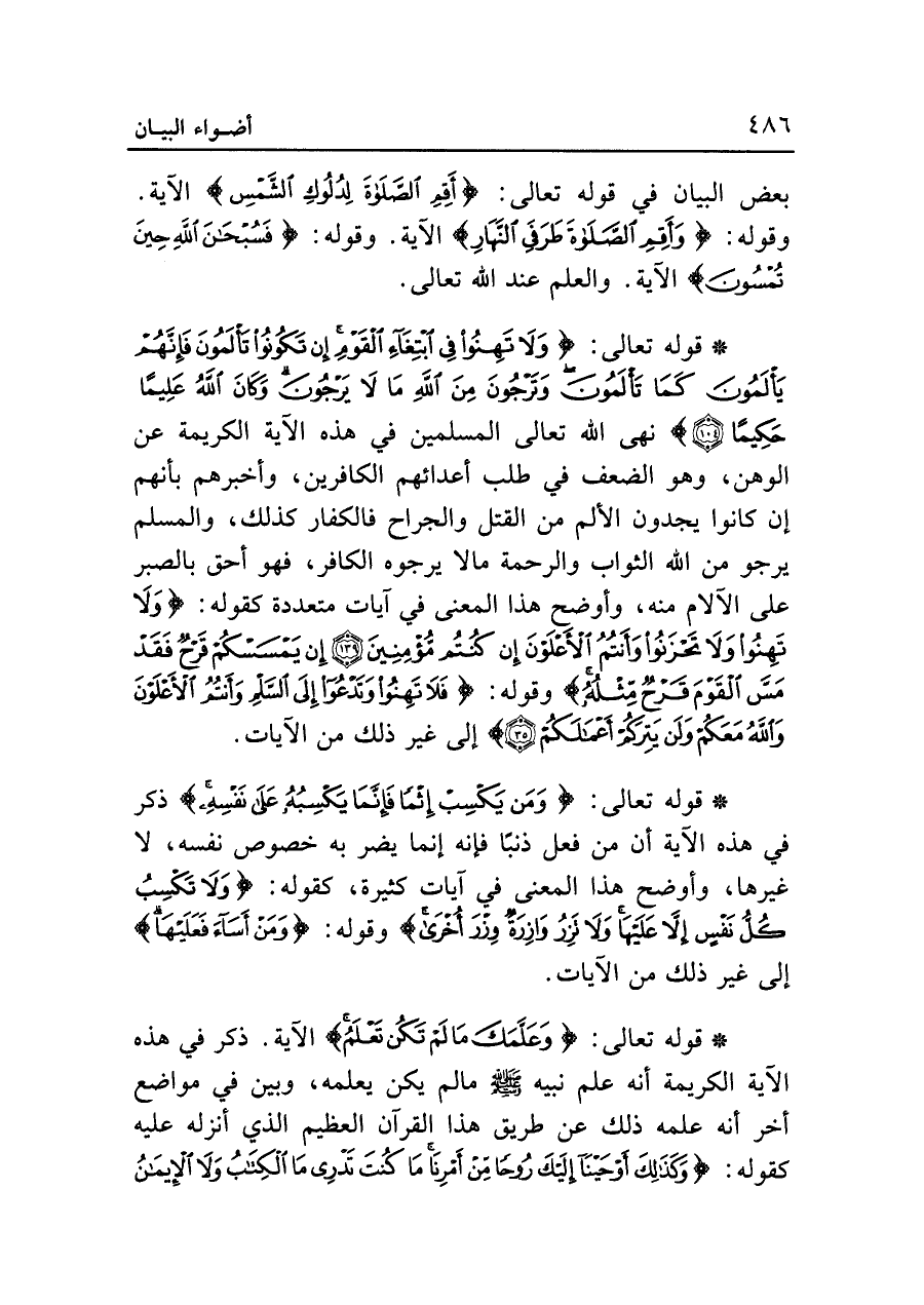 • قوله تعالى: {وَلا تَهِنُوا فِي ابْتِغَاءِ الْقَوْمِ إِنْ تَكُونُوا تَأْلَمُونَ فَإِنَّهُمْ يَأْلَمُونَ كَمَا تَأْلَمُونَ وَتَرْجُونَ مِنَ اللَّهِ مَا لا يَرْجُونَ وَكَانَ اللَّهُ عَلِيماً حَكِيماً (١٠٤)} نهى الله تعالى المسلمين في هذه الآية الكريمة عن الوهن، وهو الضعف فى طلب أعدائهم الكافرين، وأخبرهم بأنهم إن كانوا يجدون الألم من القتل والجراح فالكفار كذلك، والمسلم يرجو من الله الثواب والرحمة ما لا يرجوه الكافر، فهو أحق بالصبر على الآلام منه، وأوضح هذا المعنى في آيات متعددة كقوله: {وَلا تَهِنُوا وَلا تَحْزَنُوا وَأَنْتُمُ الْأَعْلَوْنَ إِنْ كُنْتُمْ مُؤْمِنِينَ (١٣٩) إِنْ يَمْسَسْكُمْ قَرْحٌ فَقَدْ مَسَّ الْقَوْمَ قَرْحٌ مِثْلُهُ} وقوله {فَلا تَهِنُوا وَتَدْعُوا إِلَى السَّلْمِ وَأَنْتُمُ الْأَعْلَوْنَ وَاللَّهُ مَعَكُمْ وَلَنْ يَتِرَكُمْ أَعْمَالَكُمْ (٣٥)} إلى غير ذلك من الآيات.