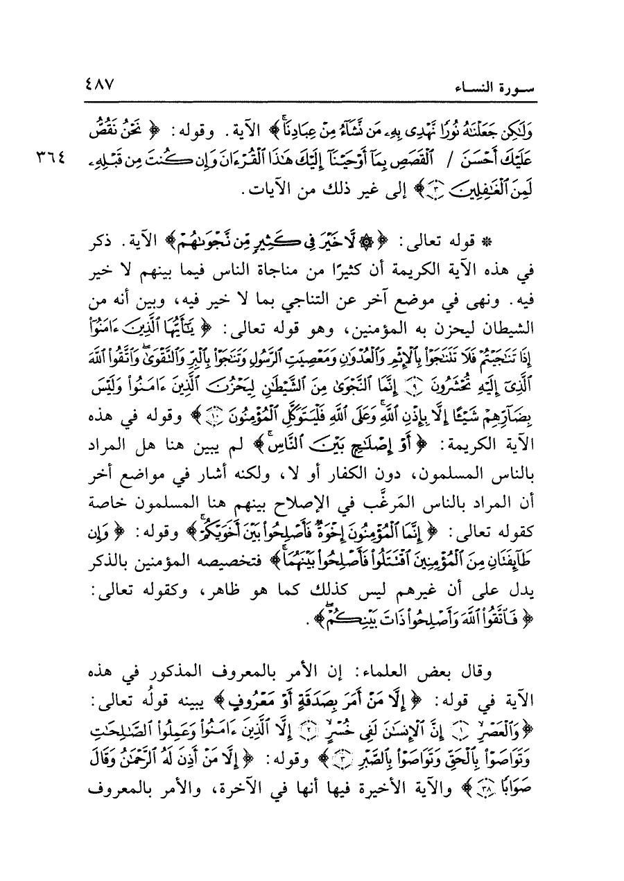 • قوله تعالى: {لا خَيْرَ فِي كَثِيرٍ مِنْ نَجْوَاهُمْ} الآية. ذكر في هذه الآية الكريمة أن كثيرا من مناجاة الناس فيما بينهم لا خير فيه. ونهى في موضع آخر عن التناجي بما لا خير فيه، وبين أنه من الشيطان ليحزن به المؤمنين، وهو قوله تعالى: {يَا أَيُّهَا الَّذِينَ آمَنُوا إِذَا تَنَاجَيْتُمْ فَلا تَتَنَاجَوْا بِالْأِثْمِ وَالْعُدْوَانِ وَمَعْصِيَتِ الرَّسُولِ وَتَنَاجَوْا بِالْبِرِّ وَالتَّقْوَى وَاتَّقُوا اللَّهَ الَّذِي إِلَيْهِ تُحْشَرُونَ (٩) إِنَّمَا النَّجْوَى مِنَ الشَّيْطَانِ لِيَحْزُنَ الَّذِينَ آمَنُوا وَلَيْسَ بِضَارِّهِمْ شَيْئاً إِلَّا بِإِذْنِ اللَّهِ وَعَلَى اللَّهِ فَلْيَتَوَكَّلِ الْمُؤْمِنُونَ (١٠)} وقوله في هذه الآية الكريمة: {أَوْ إِصْلاحٍ بَيْنَ النَّاسِ} لم يبين هنا هل المراد بالناس المسلمون، دون الكفار أو لا، ولكنه أشار في مواضع أخر أن المراد بالناس المرغب في الإصلاح بينهم هنا المسلمون خاصة كقوله تعالى: {إِنَّمَا الْمُؤْمِنُونَ إِخْوَةٌ فَأَصْلِحُوا بَيْنَ أَخَوَيْكُمْ} وقوله: {وَإِنْ طَائِفَتَانِ مِنَ الْمُؤْمِنِينَ اقْتَتَلُوا فَأَصْلِحُوا بَيْنَهُمَا} فتخصيصه المؤمنين بالذكر يدل على أن غيرهم ليس كذلك كما هو ظاهر، وكقوله تعالى: {فَاتَّقُوا اللَّهَ وَأَصْلِحُوا ذَاتَ بَيْنِكُمْ}.