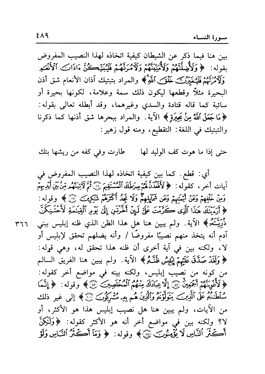 بين هنا فيما ذكر عن الشيطان كيفية اتخاذه لهذا النصيب المفروض بقوله: {وَلَأُضِلَّنَّهُمْ وَلَأُمَنِّيَنَّهُمْ وَلَآمُرَنَّهُمْ فَلَيُبَتِّكُنَّ آذَانَ الْأَنْعَامِ وَلَآمُرَنَّهُمْ فَلَيُغَيِّرُنَّ خَلْقَ اللَّهِ} والمراد بتبتيك آذان الأنعام شق أذن البحيرة مثلا وقطعها ليكون ذلك سمة وعلامة، لكونها بحيرة أو سائبة كما قاله قتادة والسدي وغيرهما، وقد أبطله تعالى بقوله: {مَا جَعَلَ اللَّهُ مِنْ بَحِيرَةٍ} الآية. والمراد ببحرها شق أذنها كما ذكرنا والتبتيك في اللغة: التقطيع، ومنه قول زهير: