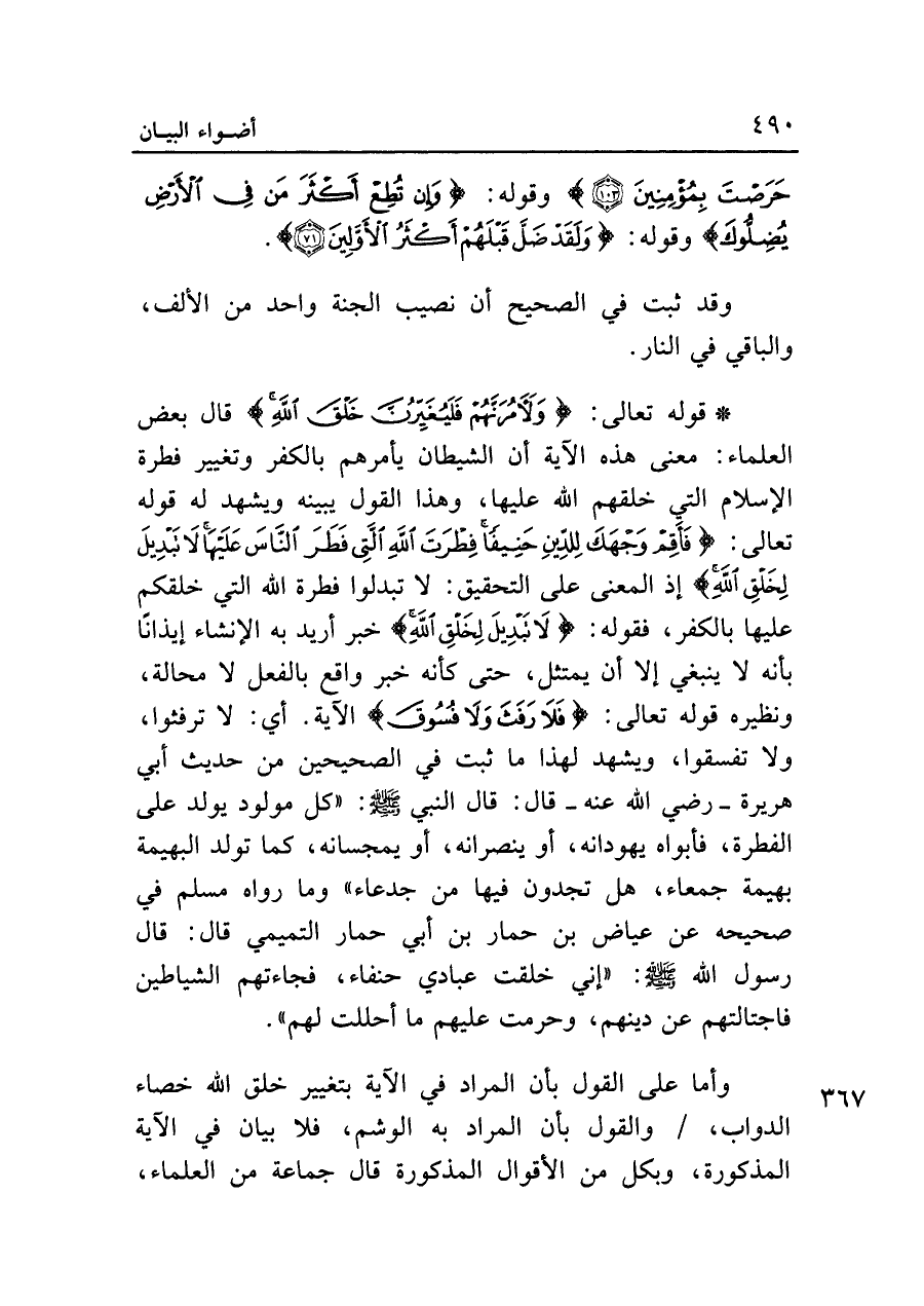 • قوله تعالى: {وَلَآمُرَنَّهُمْ فَلَيُغَيِّرُنَّ خَلْقَ اللَّهِ} قال بعض العلماء: معنى هذه الآية أن الشيطان يأمرهم بالكفر وتغيير فطرة الإسلام التي خلقهم الله عليها، وهذا القول يبينه ويشهد له قوله تعالى: {فَأَقِمْ وَجْهَكَ لِلدِّينِ حَنِيفاً فِطْرَتَ اللَّهِ الَّتِي فَطَرَ النَّاسَ عَلَيْهَا لا تَبْدِيلَ لِخَلْقِ اللَّهِ} إذ المعنى على التحقيق: لا تبدلوا فطرة الله التي خلقكم عليها بالكفر، فقوله: {لا تَبْدِيلَ لِخَلْقِ اللَّهِ} خبر أريد به الإنشاء إيذانا بأنه لا ينبغي ألا أن يمتثل، حتى كأنه خبر واقع بالفعل لا محالة، ونظيره قوله تعالى: {فَلا رَفَثَ وَلا فُسُوقَ} الآية. أي: لا ترفثوا، ولا تفسقوا، ويشهد لهذا ما ثبت في الصحيحين من حديث أبي هريرة - رضي الله عنه - قال: قال النبي - صلى الله عليه وسلم -: "كل مولود يولد على الفطرة، فأبواه يهودانه، أو ينصرانه، أو يمجسانه، كما تولد البهيمة بهيمة جمعاء، هل تجدون فيها من جدعاء" وما رواه مسلم في صحيحه عن عياض بن حمار بن أبي حمار التميمي قال: قال رسول الله - صلى الله عليه وسلم -: "إني خلقت عبادي حنفاء، فجاءتهم الشياطين فاجتالتهم عن دينهم، وحرمت عليهم ما أحللت لهم".