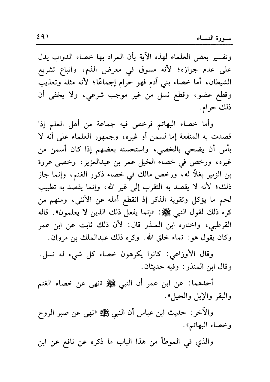 وتفسير بعض العلماء لهذه الآية بأن المراد بها خصاء الدواب يدل على عدم جوازه؛ لأنه مسوق في معرض الذم، واتباع تشريع الشيطان، أما خصاء بني آدم فهو حرام إجماعا؛ لأنه مثلة وتعذيب وقطع عضو، وقطع نسل من غير موجب شرعي، ولا يخفى أن ذلك حرام.