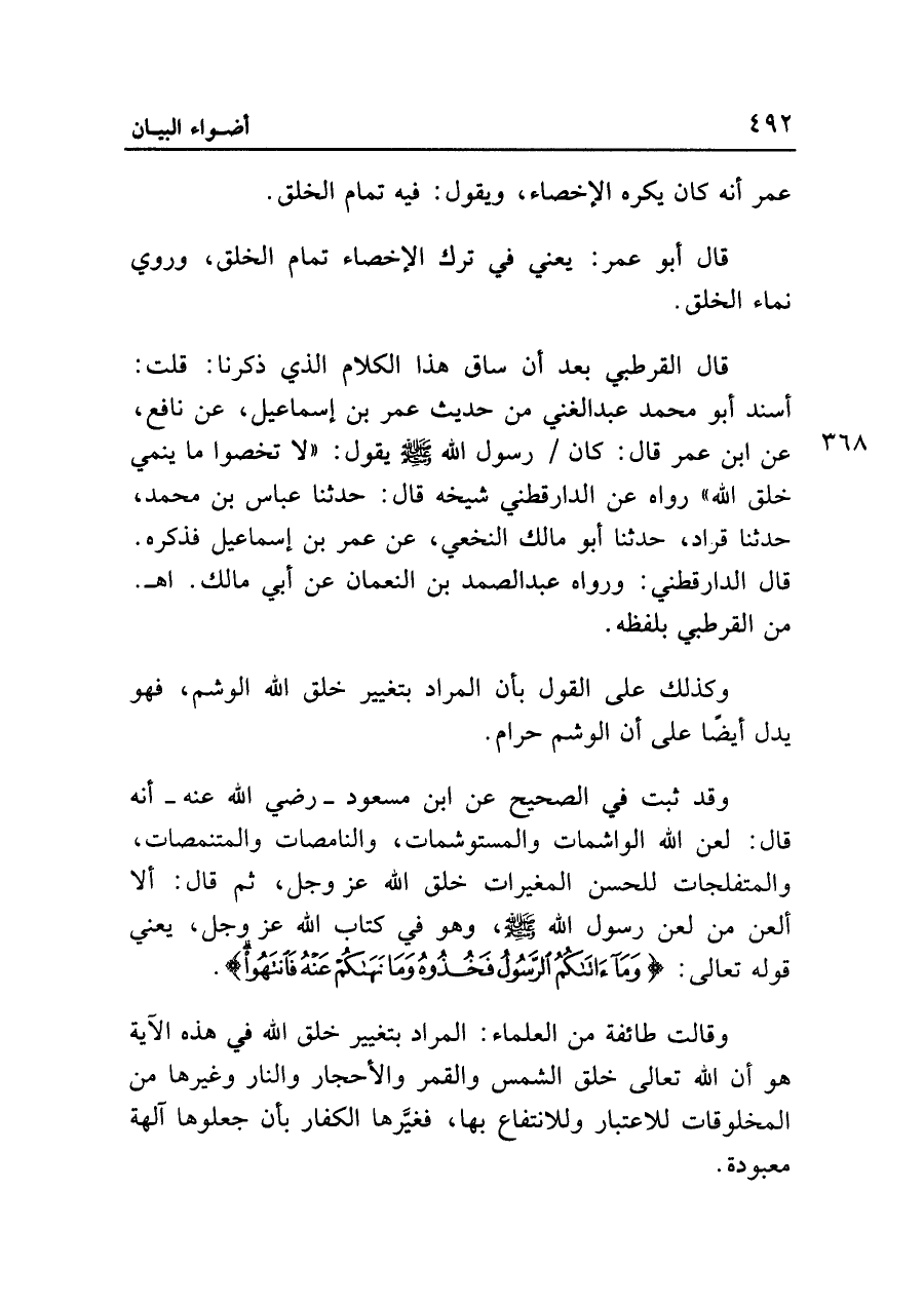 قال القرطبي بعد أن ساق هذا الكلام الذي ذكرنا: قلت: أسند أبو محمد عبد الغني من حديث عمر بن إسماعيل، عن نافع، عن ابن عمر قال: كان رسول الله - صلى الله عليه وسلم - يقول: "لا تخصوا ما ينمي خلق الله" رواه عن الدارقطني شيخه قال: حدثنا عباس بن محمد، حدثنا قراد، حدثنا أبو مالك النخعي، عن عمر بن إسماعيل فذكره. قال الدارقطني: ورواه عبد الصمد بن النعمان عن أبي مالك. اهـ. من القرطبي بلفظه.