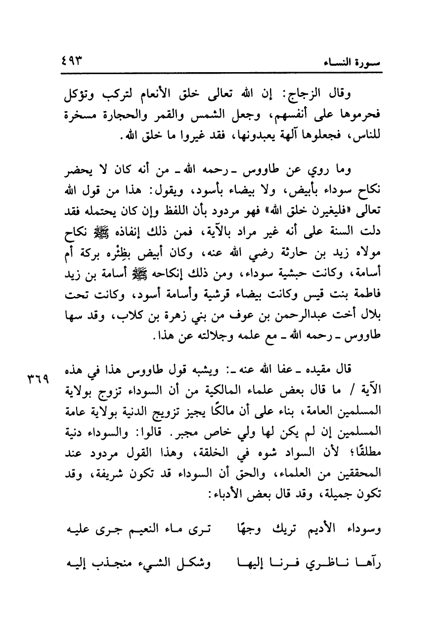 وما روى عن طاووس -رحمه الله- من أنه كان لا يحضر نكاح سوداء بأبيض، ولا بيضاء بأسود، ويقول: هذا من قول الله تعالى "فَلَيُغَيِّرُنَّ خَلْقَ اللَّهِ" فهو مردود بأن اللفظ وإن كان يحتمله فقد دلت السنة على أنه غير مراد بالآية، فمن ذلك إنفاذه - صلى الله عليه وسلم - نكاح مولاه زيد بن حارثة رضي الله عنه، وكان أبيض بظئره بركة أم أسامة، وكانت حبشية سوداء، ومن ذلك إنكاحه - صلى الله عليه وسلم - أسامة بن زيد فاطمة بنت قيس وكانت بيضاء قرشية وأسامة أسود، وكانت تحت بلال أخت عبد الرحمن بن عوف من بني زهرة بن كلاب، وقد سها طاووس -رحمه الله- مع علمه وجلالته عن هذا.