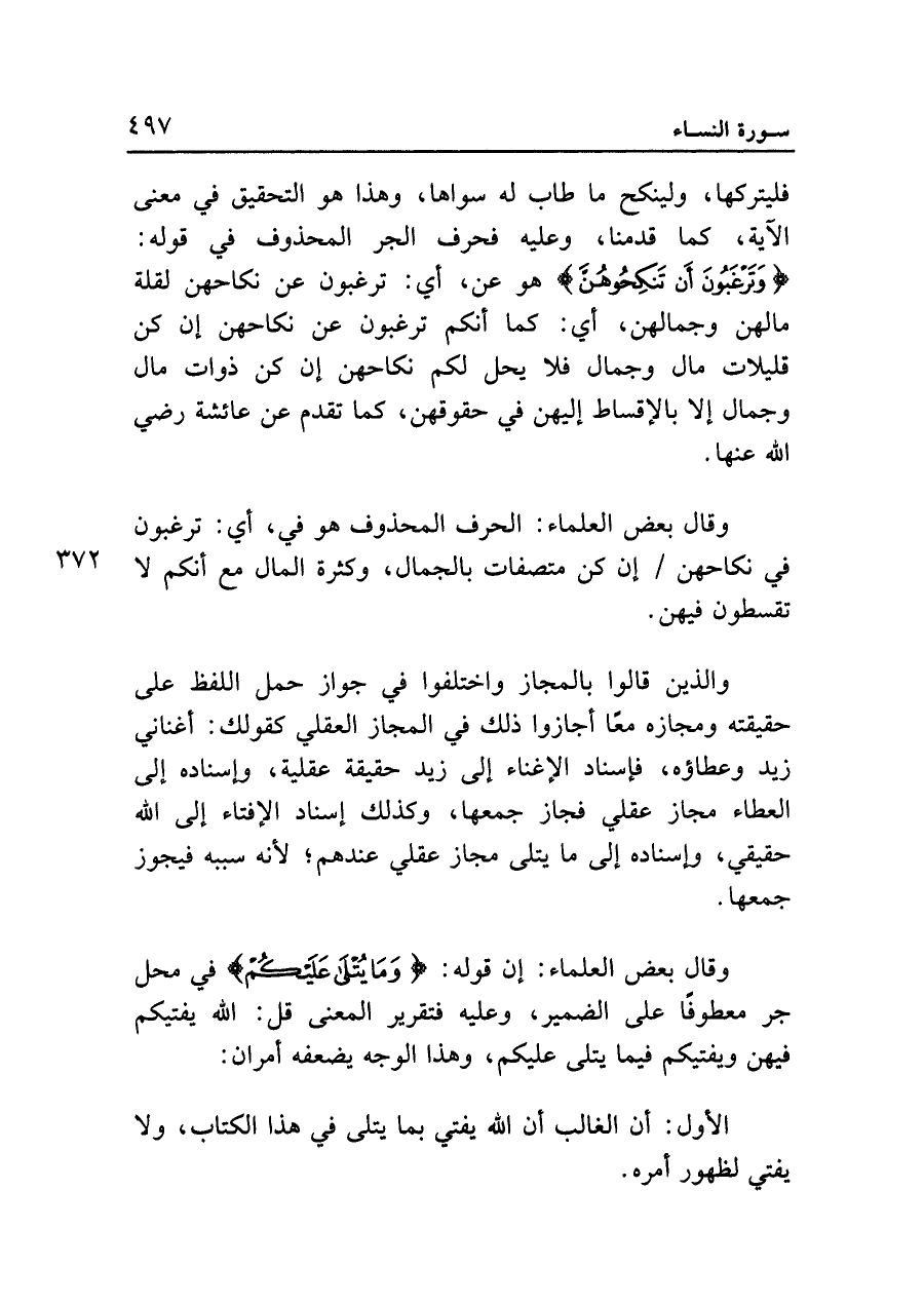 فليتركها، ولينكح ما طاب له سواها، وهذا هو التحقيق في معنى الآية، كما قدمنا، وعليه فحرف الجر المحذوف في قوله: {وَتَرْغَبُونَ أَنْ تَنْكِحُوهُنَّ} هو عن، أي: ترغبون عن نكاحهن لقلة مالهن وجمالهن، أي: كما أنكم ترغبون عن نكاحهن إن كن قليلات مال وجمال فلا يحل لكم نكاحهن إن كن ذوات مال وجمال إلا بالإقساط إليهن في حقوقهن، كما تقدم عن عائشة رضي الله عنها.