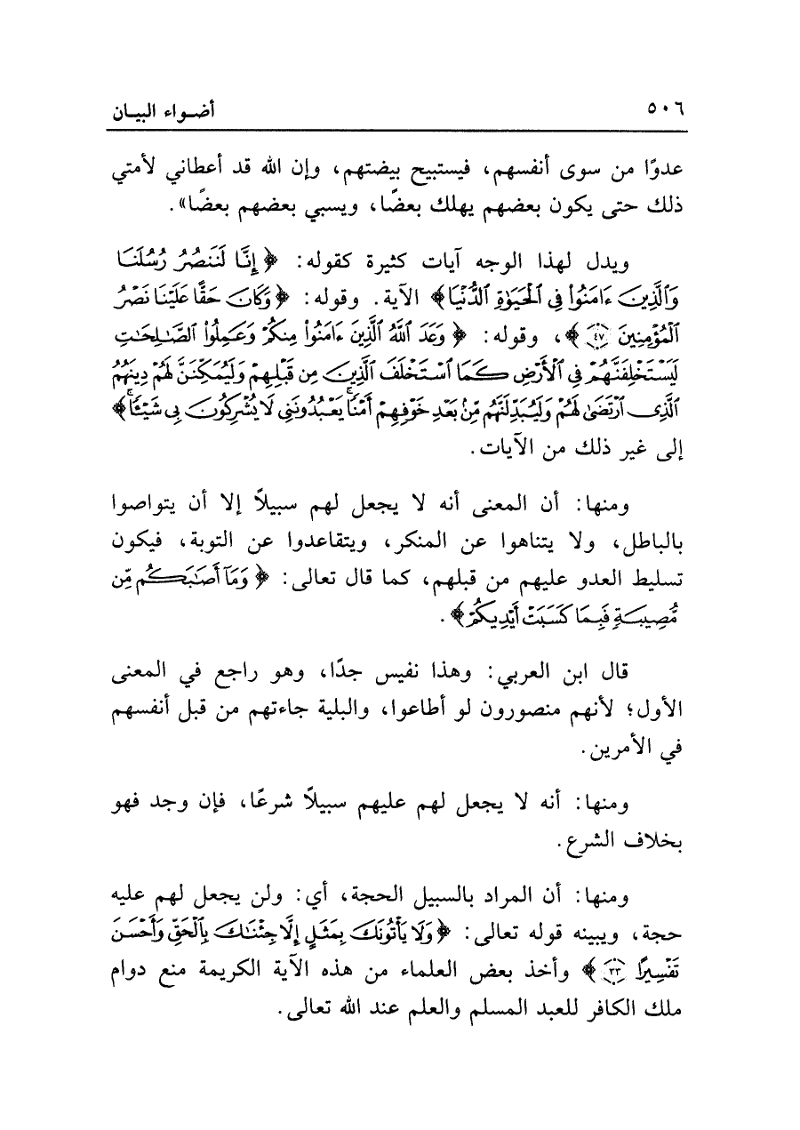 ومنها: أن المراد بالسبيل الحجة، أي: ولن يجعل لهم عليه حجة، ويبينه قوله تعالى: {وَلا يَأْتُونَكَ بِمَثَلٍ إِلَّا جِئْنَاكَ بِالْحَقِّ وَأَحْسَنَ تَفْسِيراً (٣٣)} وأخذ بعض العلماء من هذه الآية الكريمة منع دوام ملك الكافر للعبد المسلم والعلم عند الله تعالى.