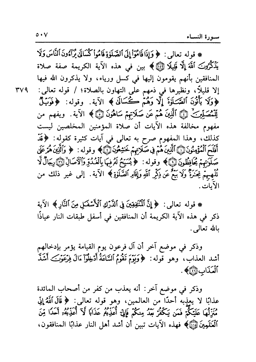 • قوله تعالى: {وَإِذَا قَامُوا إِلَى الصَّلاةِ قَامُوا كُسَالَى يُرَاءُونَ النَّاسَ وَلا يَذْكُرُونَ اللَّهَ إِلَّا قَلِيلاً (١٤٢)} بين في هذه الآية الكريمة صفة صلاة المنافقين بأنهم يقومون إليها في كسل ورياء، ولا يذكرون الله فيها إلا قليلا، ونظيرها في ذمهم على التهاون بالصلاة؛ قوله تعالى: {وَلا يَأْتُونَ الصَّلاةَ إِلَّا وَهُمْ كُسَالَى} الآية. وقوله: {فَوَيْلٌ لِلْمُصَلِّينَ (٤) الَّذِينَ هُمْ عَنْ صَلاتِهِمْ سَاهُونَ (٥)} الآية. ويفهم من مفهوم مخالفة هذه الآيات أن صلاة المؤمنين المخلصين ليست كذلك، وهذا المفهوم صرح به تعالى في آيات كثيرة كقوله: {قَدْ أَفْلَحَ الْمُؤْمِنُونَ (١) الَّذِينَ هُمْ فِي صَلاتِهِمْ خَاشِعُونَ (٢)} وقوله: {وَالَّذِينَ هُمْ عَلَى صَلَوَاتِهِمْ يُحَافِظُونَ (٩)} وقوله: {يُسَبِّحُ لَهُ فِيهَا بِالْغُدُوِّ وَالْآصَالِ (٣٦) رِجَالٌ لا تُلْهِيهِمْ تِجَارَةٌ وَلا بَيْعٌ عَنْ ذِكْرِ اللَّهِ وَإِقَامِ الصَّلاةِ} الآية. إلى غير ذلك من الآيات.