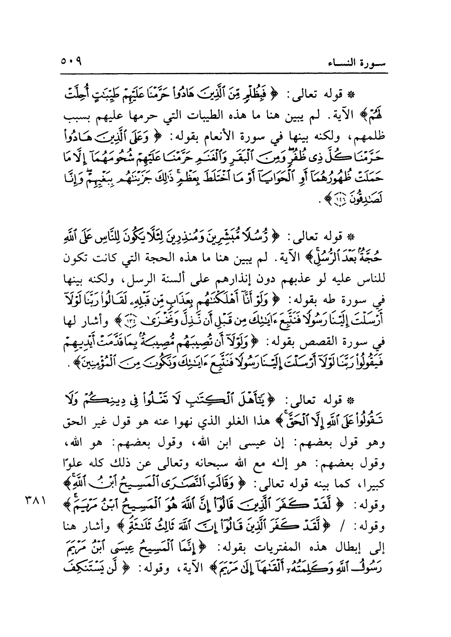 • قوله تعالى: {يَاأَهْلَ الْكِتَابِ لا تَغْلُوا فِي دِينِكُمْ وَلا تَقُولُوا عَلَى اللَّهِ إِلَّا الْحَقَّ} هذا الغلو الذي نهوا عنه هو قول غير الحق وهو قول بعضهم: إن عيسى ابن الله، وقول بعضهم: هو الله، وقول بعضهم: هو إله مع الله سبحانه وتعالى عن ذلك كله علوا كبيرا، كما بينه قوله تعالى: {وَقَالَتِ النَّصَارَى الْمَسِيحُ ابْنُ اللَّهِ} وقوله: {لَقَدْ كَفَرَ الَّذِينَ قَالُوا إِنَّ اللَّهَ هُوَ الْمَسِيحُ ابْنُ مَرْيَمَ} وقوله: {لَقَدْ كَفَرَ الَّذِينَ قَالُوا إِنَّ اللَّهَ ثَالِثُ ثَلاثَةٍ} وأشار هنا إلى إبطال هذه المفتريات بقوله: {إِنَّمَا الْمَسِيحُ عِيسَى ابْنُ مَرْيَمَ رَسُولُ اللَّهِ وَكَلِمَتُهُ أَلْقَاهَا إِلَى مَرْيَمَ} الآية، وقوله: {لَنْ يَسْتَنْكِفَ