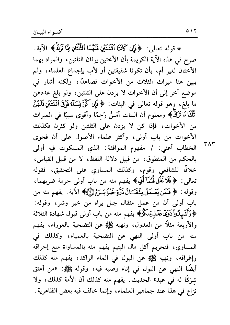 • قوله تعالى: {فَإِنْ كَانَتَا اثْنَتَيْنِ فَلَهُمَا الثُّلُثَانِ مِمَّا تَرَكَ} الآية. صرح في هذه الآية الكريمة بأن الأختين يرثان الثلثين، والمراد بهما الأختان لغير أم، بأن تكونا شقيقتين أو لأب بإجماع العلماء، ولم يبين هنا ميراث الثلاث من الأخوات فصاعدا، ولكنه أشار في موضع آخر إلى أن الأخوات لا يزدن على الثلثين، ولو بلغ عددهن ما بلغ، وهو قوله تعالى في البنات: {فَإِنْ كُنَّ نِسَاءً فَوْقَ اثْنَتَيْنِ فَلَهُنَّ ثُلُثَا مَا تَرَكَ} [النساء: ١١] ومعلوم أن البنات أمس رحما وأقوى سببا في الميراث من الأخوات، فإذا كن لا يزدن على الثلثين ولو كثرن فكذلك الأخوات من باب أولى، وأكثر علماء الأصول على أن فحوى الخطاب أعني: مفهوم الموافقة: الذي المسكوت فيه أولى بالحكم من المنطوق، من قبيل دلالة اللفظ، لا من قبيل القياس، خلافا للشافعي وقوم، وكذلك المساوئ على التحقيق، فقوله تعالى: {فَلا تَقُلْ لَهُمَا أُفٍّ} يفهم منه من باب أولى حرمة ضربهما، وقوله: {فَمَنْ يَعْمَلْ مِثْقَالَ ذَرَّةٍ خَيْراً يَرَهُ (٧)} الآية. يفهم منه من باب أولى أن من عمل مثقال جبل يراه من خير وشر، وقوله: {وَأَشْهِدُوا ذَوَيْ عَدْلٍ مِنْكُمْ} يفهم منه من باب أولى قبول شهادة الثلاثة والأربعة مثلا من العدول، ونهيه - صلى الله عليه وسلم - عن التضحية بالعوراء، يفهم منه من باب أولى النهي عن التضحية بالعمياء، وكذلك في المساوي، فتحريم أكل مال اليتيم يفهم منه بالمساواة منع إحراقه وإغراقه، ونهيه - صلى الله عليه وسلم - عن البول في الماء الراكد، يفهم منه كذلك أيضا النهي عن البول في إناء وصبه فيه، وقوله - صلى الله عليه وسلم -: "من أعتق شركا له في عبد" الحديث. يفهم منه كذلك أن الأمة كذلك، ولا نزاع في هذا عند جماهير العلماء، وإنما خالف فيه بعض الظاهرية.