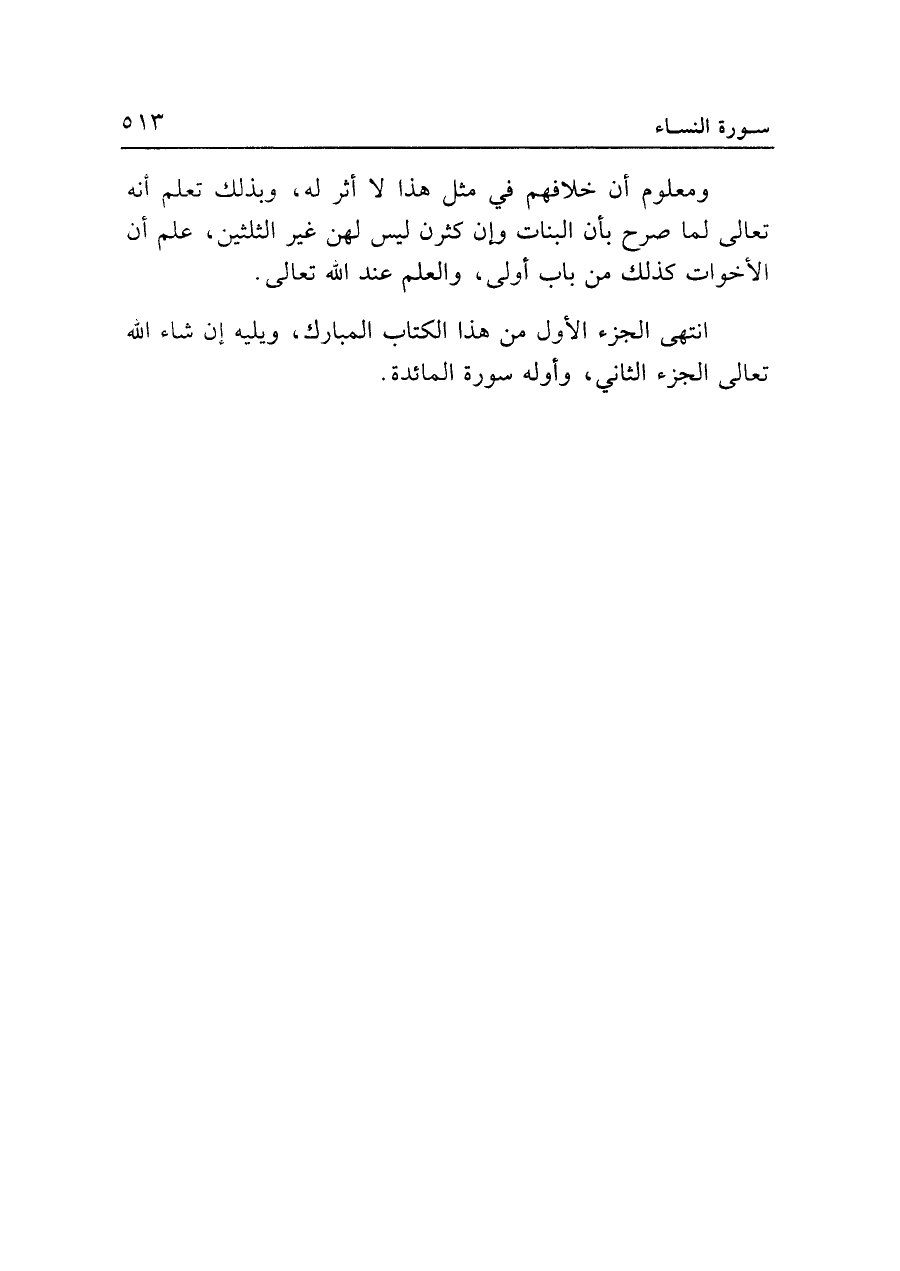 انتهى الجزء الأول من هذا الكتاب المبارك، ويليه إن شاء الله تعالى الجزء الثاني، وأوله سورة المائدة.