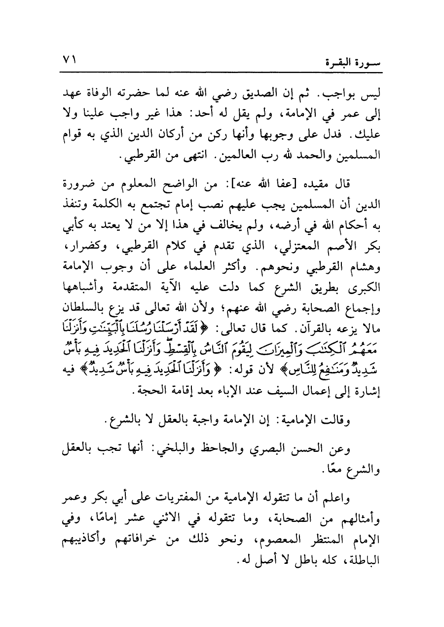 قال مقيدة [عفا الله عنه]: من الواضح المعلوم من ضرورة الدين أن المسلمين يجب عليهم نصب إمام تجتمع به الكلمة وتنفذ به أحكام الله في أرضه، ولم يخالف في هذا إلا من لا يعتد به كأبي بكر الأصم المعتزلي، الذي تقدم في كلام القرطبي، وكضرار، وهشام القرطبي ونحوهم. وأكثر العلماء على أن وجوب الإمامة الكبرى بطريق الشرع كما دلت عليه الآية المتقدمة وأشباهها وإجماع الصحابة رضي الله عنهم؛ ولأن الله تعالى قد يزع بالسلطان ما لا يزعه بالقرآن. كما قال تعالى: {لَقَدْ أَرْسَلْنَا رُسُلَنَا بِالْبَيِّنَاتِ وَأَنْزَلْنَا مَعَهُمُ الْكِتَابَ وَالْمِيزَانَ لِيَقُومَ النَّاسُ بِالْقِسْطِ وَأَنْزَلْنَا الْحَدِيدَ فِيهِ بَأْسٌ شَدِيدٌ وَمَنَافِعُ لِلنَّاسِ} لأن قوله: {وَأَنْزَلْنَا الْحَدِيدَ فِيهِ بَأْسٌ شَدِيدٌ} فيه إشارة إلى إعمال السيف عند الإباء بعد إقامة الحجة.