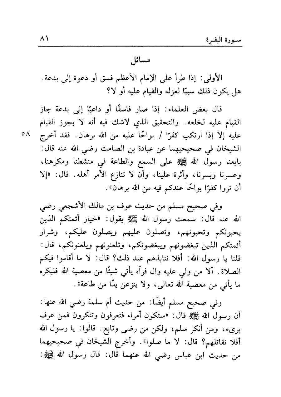 وفي صحيح مسلم أيضا: من حديث أم سلمة رضي الله عنها: أن رسول الله - صلى الله عليه وسلم - قال: "ستكون أمراء فتعرفون وتنكرون فمن عرف بريء، ومن أنكر سلم، ولكن من رضى وتابع. قالوا: يا رسول الله أفلا نقاتلهم؟ قال: لا ما صلوا". وأخرج الشيخان في صحيحيهما من حديث ابن عباس رضي الله عنهما قال: قال رسول الله - صلى الله عليه وسلم -:
