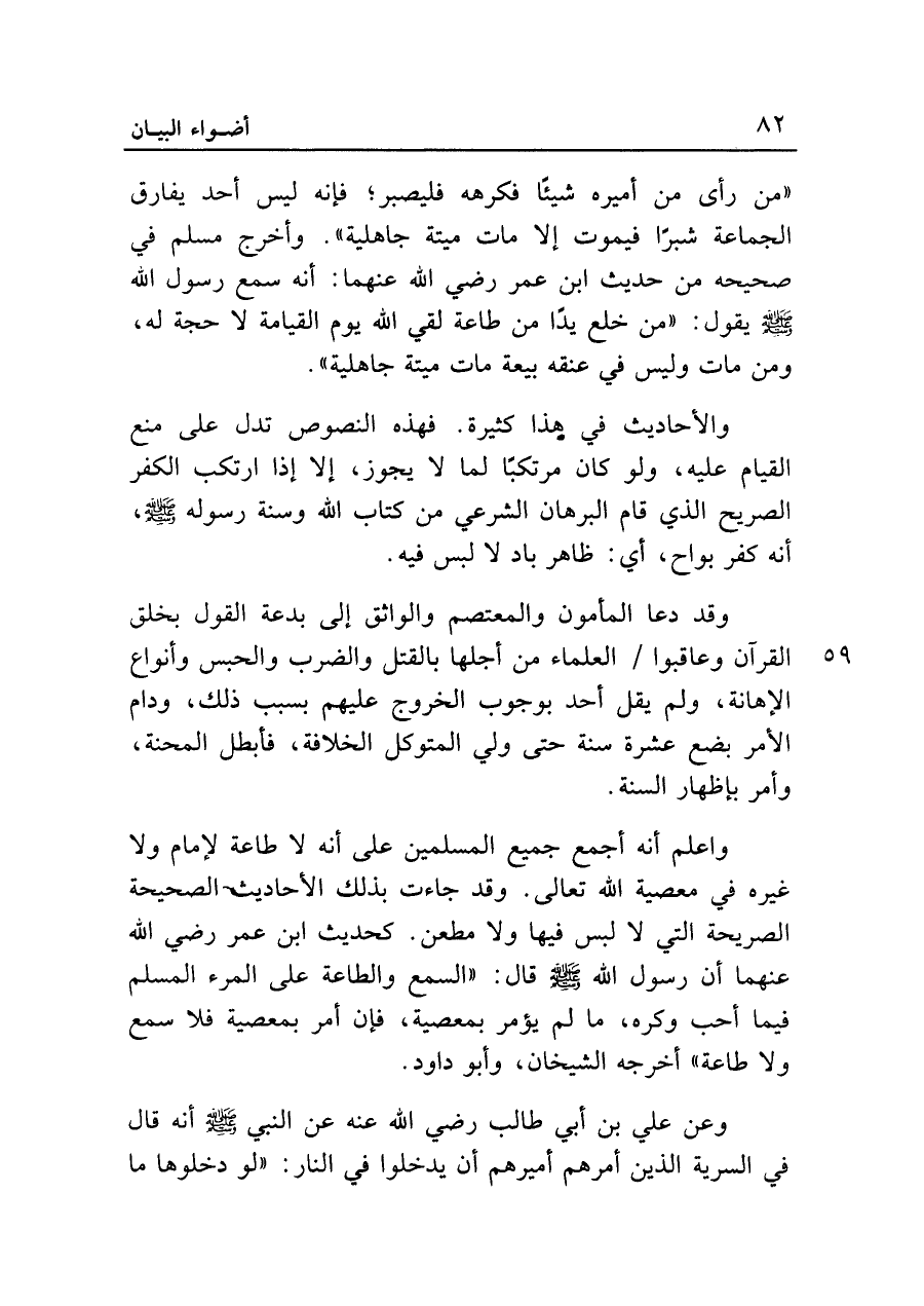 واعلم أنه أجمع جميع المسلمين على أنه لا طاعة لإمام ولا غيره في معصية الله تعالى. وقد جاءت بذلك الأحاديث الصحيحة الصريحة التي لا لبس فيها ولا مطعن. كحديث ابن عمر رضي الله عنهما أن رسول الله - صلى الله عليه وسلم - قال: "السمع والطاعة على المرء المسلم فيما أحب وكره، ما لم يؤمر بمعصية، فإن أمر بمعصية فلا سمع ولا طاعة" أخرجه الشيخان، وأبو داود.