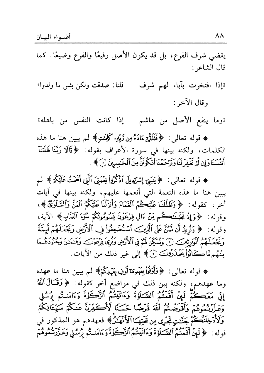 • قوله تعالى: {فَتَلَقَّى آدَمُ مِنْ رَبِّهِ كَلِمَاتٍ} لم يبين هنا ما هذه الكلمات، ولكنه بينها في سورة الأعراف بقوله: {قالا رَبَّنَا ظَلَمْنَا أَنْفُسَنَا وَإِنْ لَمْ تَغْفِرْ لَنَا وَتَرْحَمْنَا لَنَكُونَنَّ مِنَ الْخَاسِرِينَ (٢٣)}.