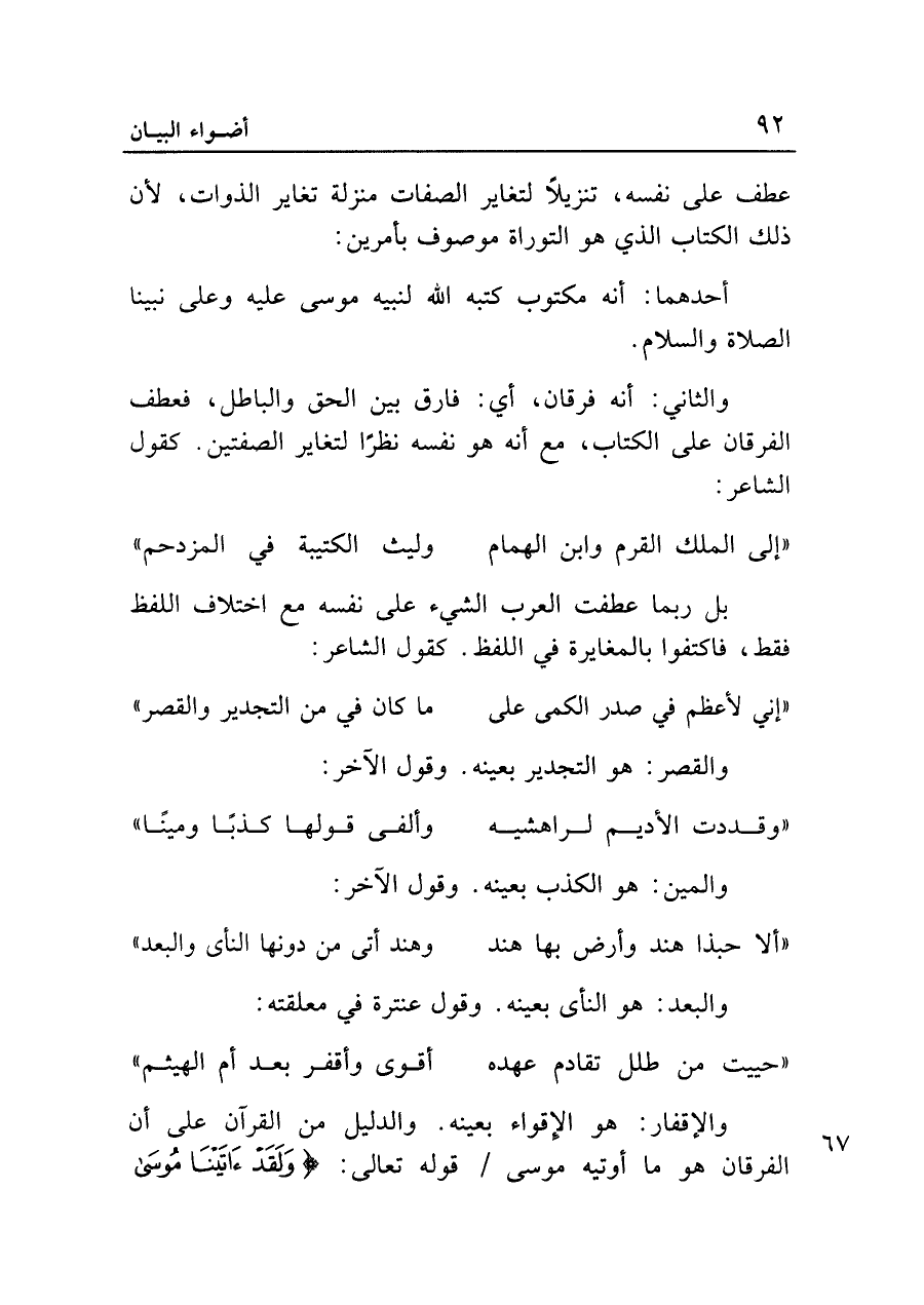 والثاني: أنه فرقان، أي: فارق بين الحق والباطل، فعطف الفرقان على الكتاب، مع أنه هو نفسه نظرا لتغاير الصفتين. كقول الشاعر: