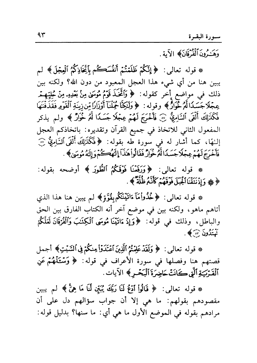 • قوله تعالى: {إِنَّكُمْ ظَلَمْتُمْ أَنْفُسَكُمْ بِاتِّخَاذِكُمُ الْعِجْلَ} لم يبين هنا من أي شيء هذا العجل المعبود من دون الله؟ ولكنه بين ذلك في مواضع أخر كقوله {وَاتَّخَذَ قَوْمُ مُوسَى مِنْ بَعْدِهِ مِنْ حُلِيِّهِمْ عِجْلاً جَسَداً لَهُُ خُوَارٌ} وقوله: {وَلَكِنَّا حُمِّلْنَا أَوْزَاراً مِنْ زِينَةِ الْقَوْمِ فَقَذَفْنَاهَا فَكَذَلِكَ أَلْقَى السَّامِرِيُّ (٨٧) فَأَخْرَجَ لَهُمْ عِجْلاً جَسَداً لَهُ خُوَارٌ} ولم يذكر المفعول الثاني للاتخاذ في جميع القرآن وتقديره: باتخاذكم العجل إلها، كما أشار له في سورة طه بقوله: {فَكَذَلِكَ أَلْقَى السَّامِرِيُّ (٨٧) فَأَخْرَجَ لَهُمْ عِجْلاً جَسَداً لَهُ خُوَارٌ فَقَالُوا هَذَا إِلَهُكُمْ وَإِلَهُ مُوسَى}.