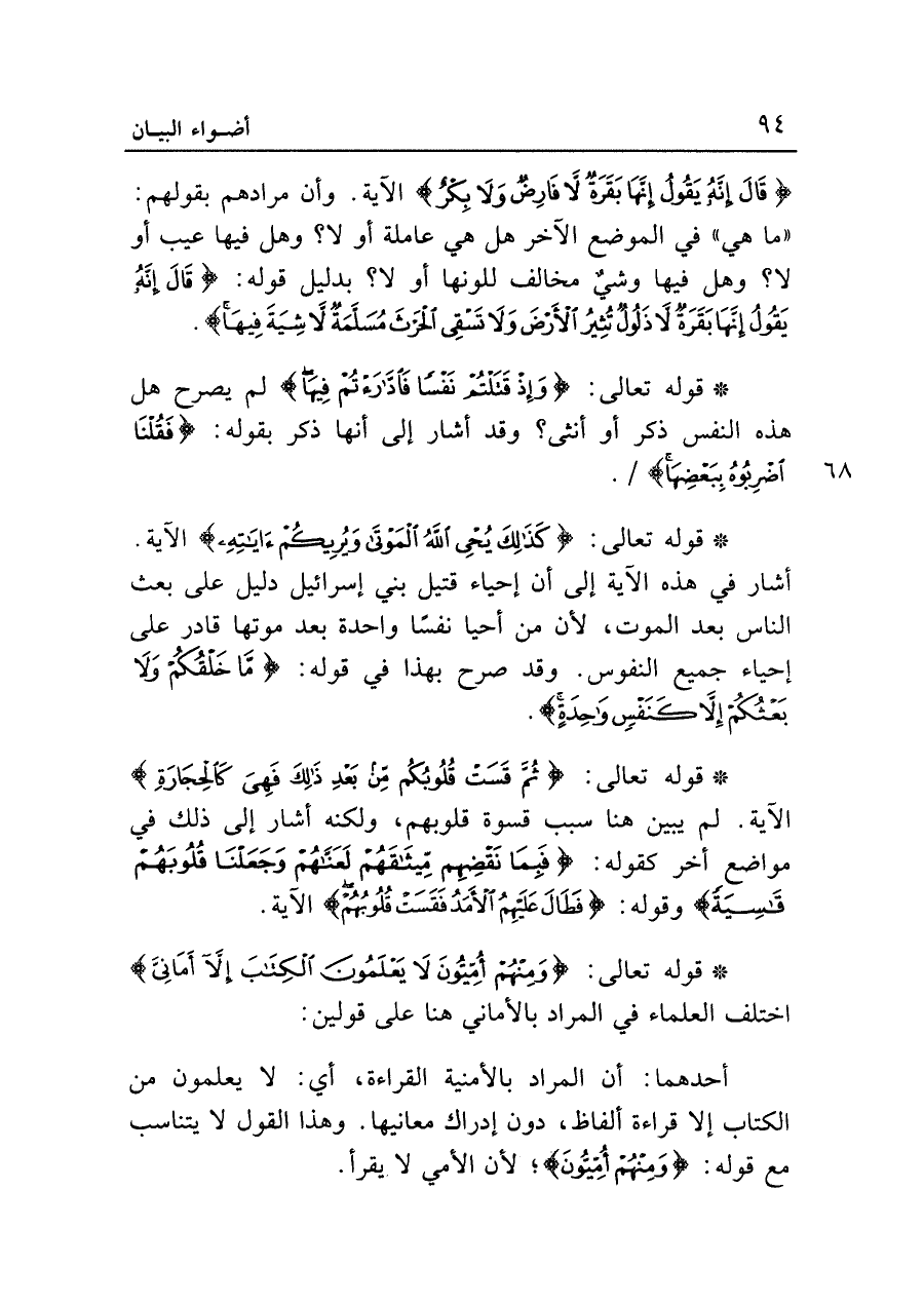 {قَالَ إِنَّهُ يَقُولُ إِنَّهَا بَقَرَةٌ لا فَارِضٌ وَلا بِكْرٌ} الآية. وأن مرادهم بقولهم: "مَا هِيَ" في الموضع الآخر هل هي عاملة أو لا؟ وهل فيها عيب أو لا؟ وهل فيها وشي مخالف للونها أو لا؟ بدليل قوله: {قَالَ إِنَّهُ يَقُولُ إِنَّهَا بَقَرَةٌ لا ذَلُولٌ تُثِيرُ الْأَرْضَ وَلا تَسْقِي الْحَرْثَ مُسَلَّمَةٌ لا شِيَةَ فِيهَا}.