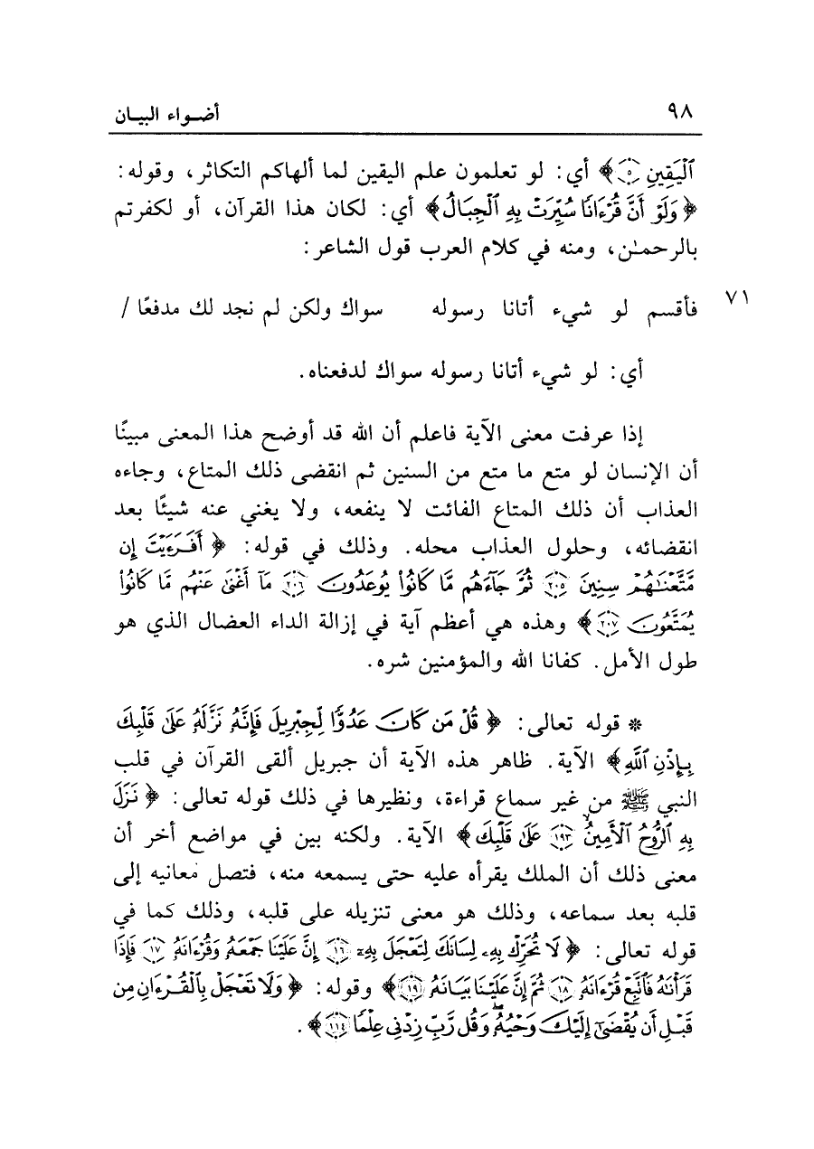 • قوله تعالى: {قُلْ مَنْ كَانَ عَدُوّاً لِجِبْرِيلَ فَإِنَّهُ نَزَّلَهُ عَلَى قَلْبِكَ بِإِذْنِ اللَّهِ} الآية. ظاهر هذه الآية أن جبريل ألقى القرآن في قلب النبي - صلى الله عليه وسلم - من غير سماع قراءة، ونظيرها في ذلك قوله تعالى: {نَزَلَ بِهِ الرُّوحُ الْأَمِينُ (١٩٣) عَلَى قَلْبِكَ} الآية. ولكنه بين في مواضع أخر أن معنى ذلك أن الملك يقرأه عليه حتى يسمعه منه، فتصل معانيه إلى قلبه بعد سماعه، وذلك هو معنى تنزيله على قلبه، وذلك كما في قوله تعالى: {لا تُحَرِّكْ بِهِ لِسَانَكَ لِتَعْجَلَ بِهِ (١٦) إِنَّ عَلَيْنَا جَمْعَهُ وَقُرْآنَهُ (١٧) فَإِذَا قَرَأْنَاهُ فَاتَّبِعْ قُرْآنَهُ (١٨) ثُمَّ إِنَّ عَلَيْنَا بَيَانَهُ (١٩)} وقوله: {وَلا تَعْجَلْ بِالْقُرْآنِ مِنْ قَبْلِ أَنْ يُقْضَى إِلَيْكَ وَحْيُهُ وَقُلْ رَبِّ زِدْنِي عِلْماً (١١٤)}.