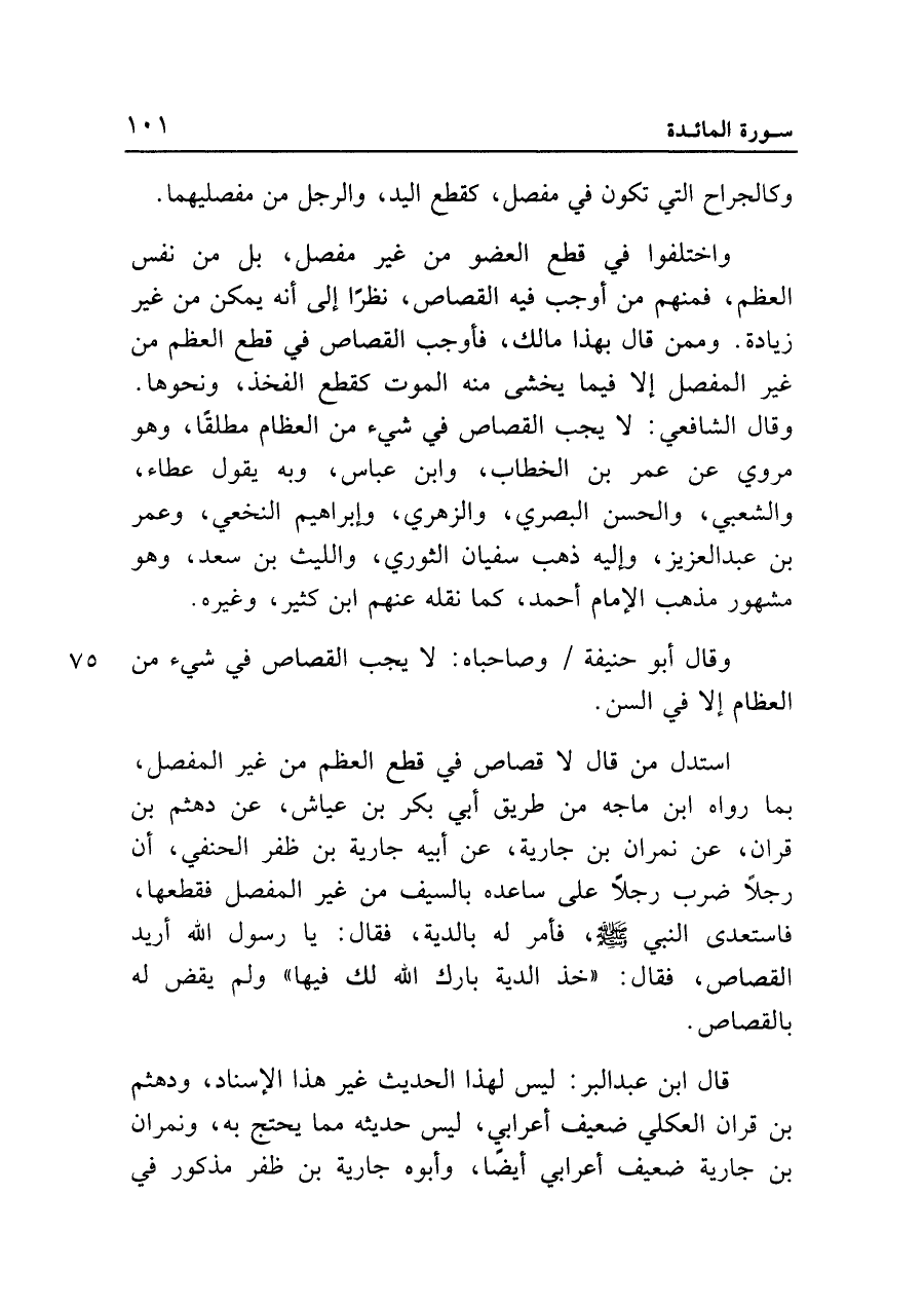 استدل من قال لا قصاص في قطع العظم من غير المفصل، بما رواه ابن ماجه من طريق أبي بكر بن عياش، عن دهثم بن قران، عن نمران بن جارية، عن أبيه جارية بن ظفر الحنفي، أن رجلاً ضرب رجلاً على ساعده بالسيف من غير المفصل فقطعها، فاستعدى النبي - صلى الله عليه وسلم -، فأمر له بالدية، فقال: يا رسول الله أريد القصاص، فقال: "خذ الدية بارك الله لك فيها" ولم يقض له بالقصاص.
