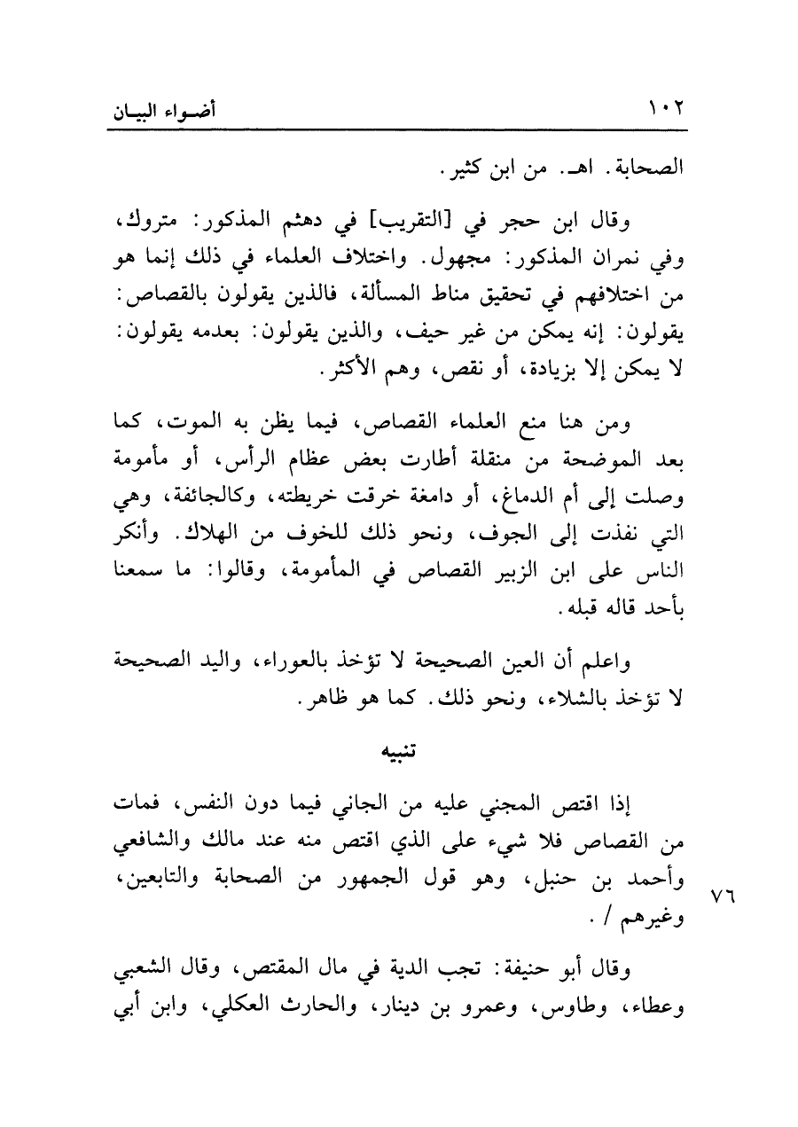 وقال ابن حجر في [التقريب] في دهثم المذكور: متروك، وفي نمران المذكور: مجهول. واختلاف العلماء في ذلك إنما هو من اختلافهم في تحقيق مناط المسألة، فالذين يقولون بالقصاص: يقولون: إنه يمكن من غير حيف، والذين يقولون: بعدمه يقولون: لا يمكن إلا بزيادة، أو نقص، وهم الأكثر.