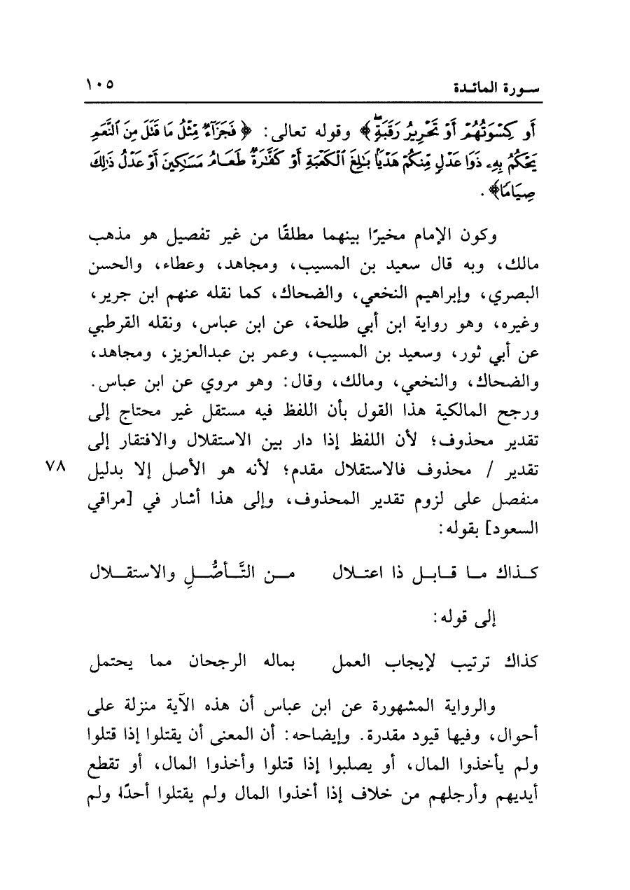 وكون الإمام مخيراً بينهما مطلقاً من غير تفصيل هو مذهب مالك، وبه قال سعيد بن المسيب، ومجاهد، وعطاء، والحسن البصري، وإبراهيم النخعي، والضحاك، كما نقله عنهم ابن جرير، وغيره، وهو رواية ابن أبي طلحة، عن ابن عباس، ونقله القرطبي عن أبي ثور، وسعيد بن المسيب، وعمر بن عبد العزيز، ومجاهد، والضحاك، والنخعي، ومالك، وقال: وهو مروي عن ابن عباس. ورجح المالكية هذا القول بأن اللفظ فيه مستقل غير محتاج إلى تقدير محذوف؛ لأن اللفظ إذا دار بين الاستقلال والافتقار إلى تقدير محذوف فالاستقلال مقدم؛ لأنه هو الأصل إلا بدليل منفصل على لزوم تقدير المحذوف، وإلى هذا أشار في [مراقي السعود] بقوله: