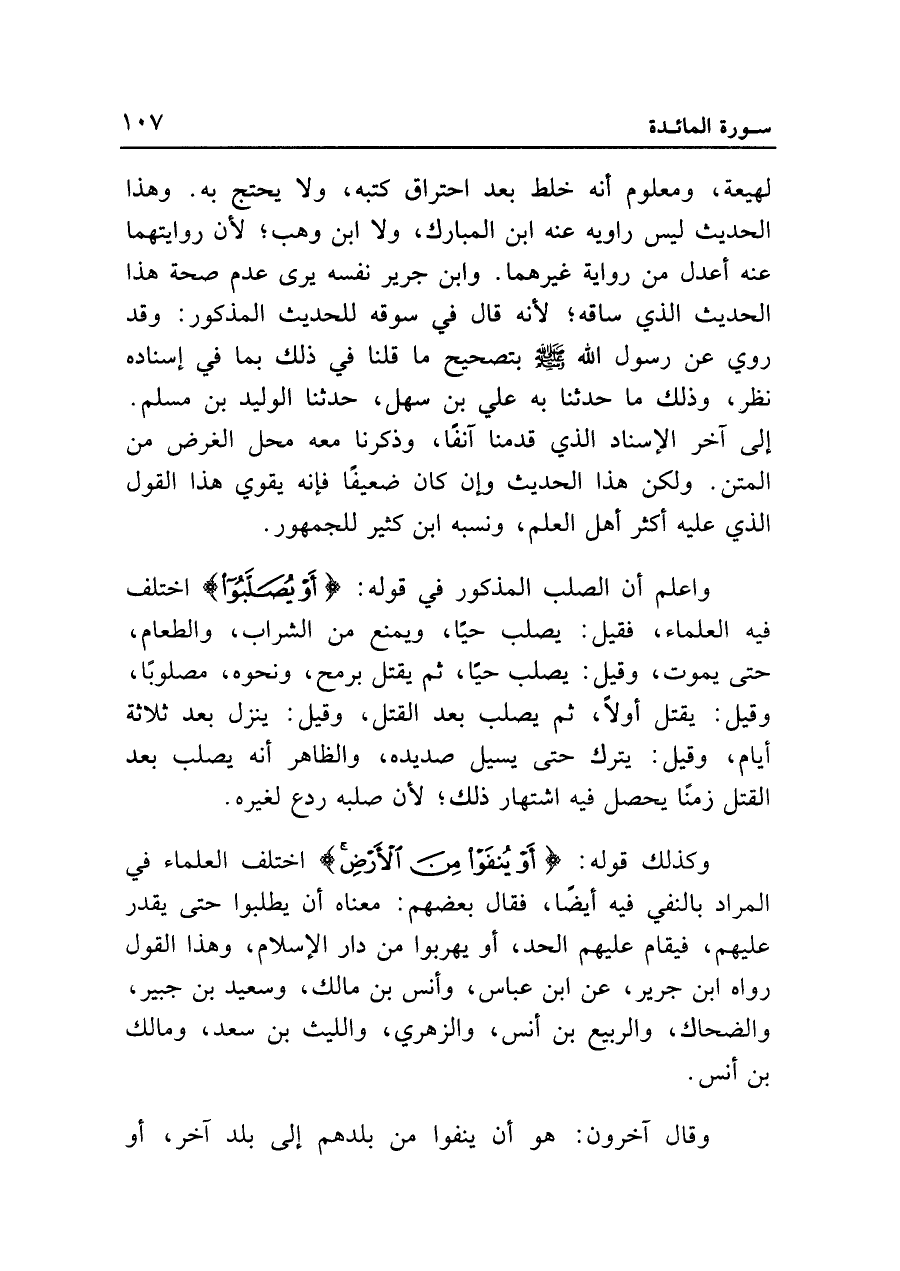 وكذلك قوله: {أَوْ يُنْفَوْا مِنَ الْأَرْضِ} اختلف العلماء في المراد بالنفي فيه أيضاً، فقال بعضهم: معناه أن يطلبوا حتى يقدر عليهم، فيقام عليهم الحد، أو يهربوا من دار الإسلام، وهذا القول رواه ابن جرير، عن ابن عباس، وأنس بن مالك، وسعيد بن جبير، والضحاك، والربيع بن أنس، والزهري، والليث بن سعد، ومالك بن أنس.