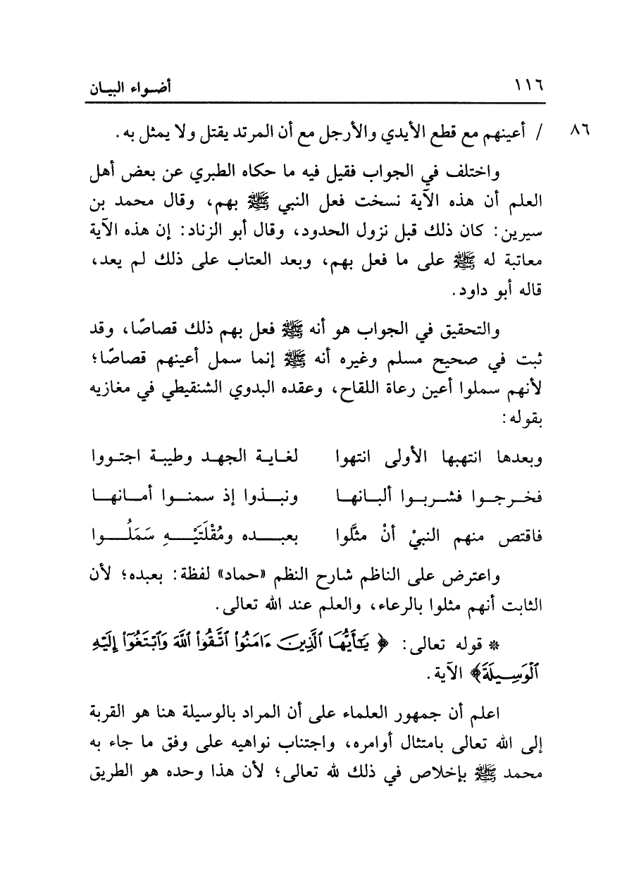 والتحقيق في الجواب هو أنه - صلى الله عليه وسلم - فعل بهم ذلك قصاصاً، وقد ثبت في صحيح مسلم وغيره أنه - صلى الله عليه وسلم - إنما سمل أعينهم قصاصاً؛ لأنهم سملوا أعين رعاة اللقاح، وعقده البدوي الشنقيطي في مغازيه بقوله: