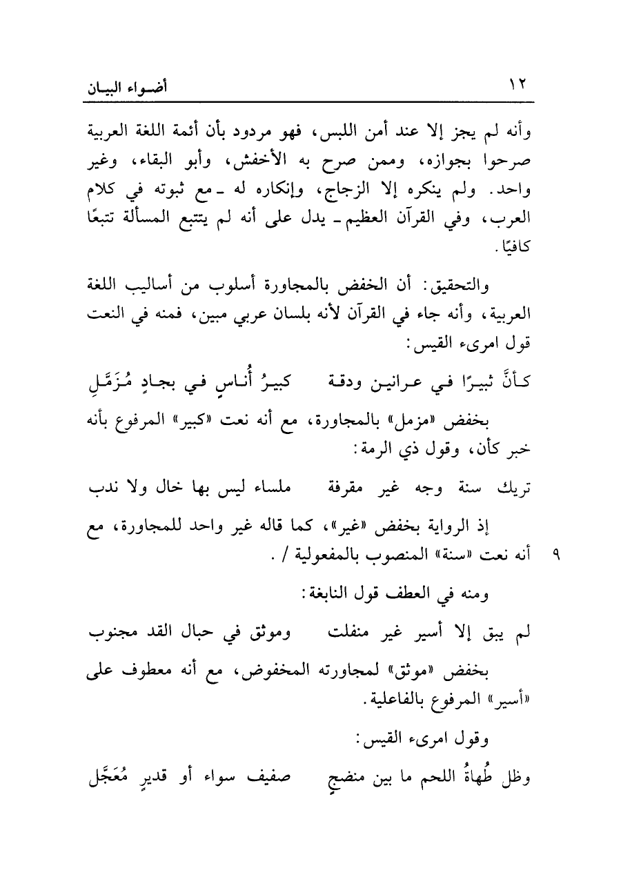 والتحقيق: أن الخفض بالمجاورة أسلوب من أساليب اللغة العربية، وأنه جاء في القرآن لأنه بلسان عربي مبين، فمنه في النعت قول امرىء القيس: