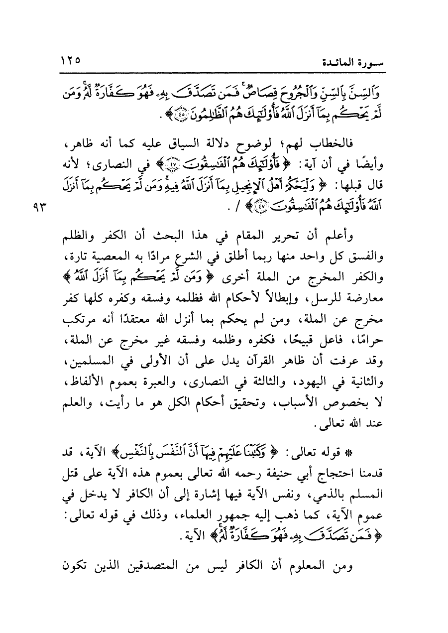 • قوله تعالى: {وَكَتَبْنَا عَلَيْهِمْ فِيهَا أَنَّ النَّفْسَ بِالنَّفْسِ} الآية، قد قدمنا احتجاج أبي حنيفة رحمه الله تعالى بعموم هذه الآية على قتل المسلم بالذمي، ونفس الآية فيها إشارة إلى أن الكافر لا يدخل في عموم الآية، كما ذهب إليه جمهور العلماء، وذلك في قوله تعالى: {فَمَنْ تَصَدَّقَ بِهِ فَهُوَ كَفَّارَةٌ لَهُ} الآية.