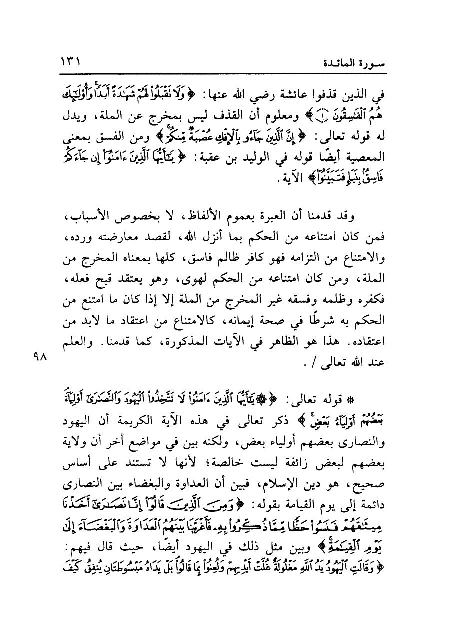 • قوله تعالى: {يَا أَيُّهَا الَّذِينَ آمَنُوا لا تَتَّخِذُوا الْيَهُودَ وَالنَّصَارَى أَوْلِيَاءَ بَعْضُهُمْ أَوْلِيَاءُ بَعْضٍ} ذكر تعالى في هذه الآية الكريمة أن اليهود والنصارى بعضهم أولياء بعض، ولكنه بين في مواضع أخر أن ولاية بعضهم لبعض زائفة ليست خالصة؛ لأنها لا تستند على أساس صحيح، هو دين الإسلام، فبين أن العداوة والبغضاء بين النصارى دائمة إلى يوم القيامة بقوله: {وَمِنَ الَّذِينَ قَالُوا إِنَّا نَصَارَى أَخَذْنَا مِيثَاقَهُمْ فَنَسُوا حَظّاً مِمَّا ذُكِّرُوا بِهِ فَأَغْرَيْنَا بَيْنَهُمُ الْعَدَاوَةَ وَالْبَغْضَاءَ إِلَى يَوْمِ الْقِيَامَةِ} وبين مثل ذلك في اليهود أيضاً، حيث قال فيهم: {وَقَالَتِ الْيَهُودُ يَدُ اللَّهِ مَغْلُولَةٌ غُلَّتْ أَيْدِيهِمْ وَلُعِنُوا بِمَا قَالُوا بَلْ يَدَاهُ مَبْسُوطَتَانِ يُنْفِقُ كَيْفَ