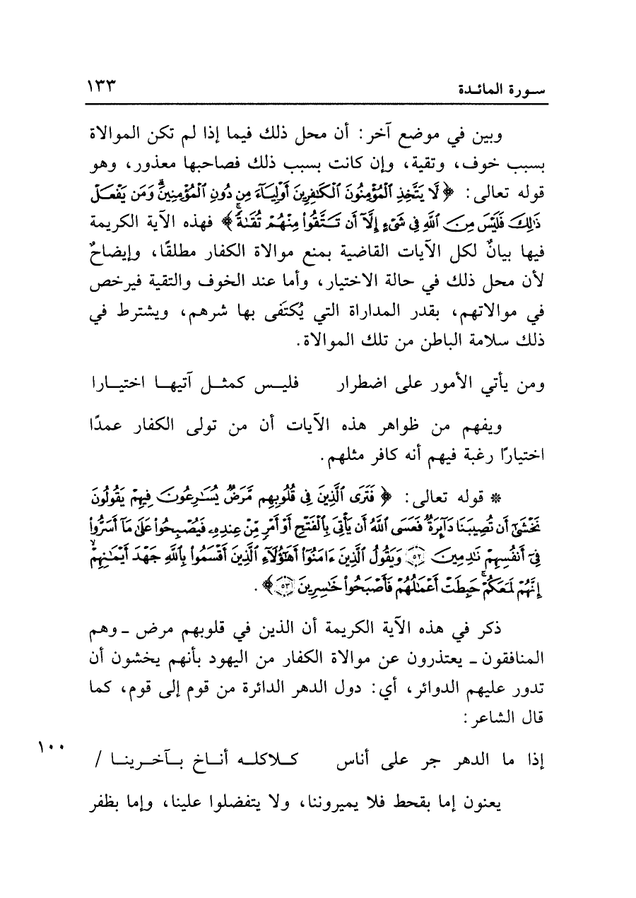 ذكر في هذه الآية الكريمة أن الذين في قلوبهم مرض -وهم المنافقون- يعتذرون عن موالاة الكفار من اليهود بأنهم يخشون أن تدور عليهم الدوائر، أي: دول الدهر الدائرة من قوم إلى قوم، كما قال الشاعر: