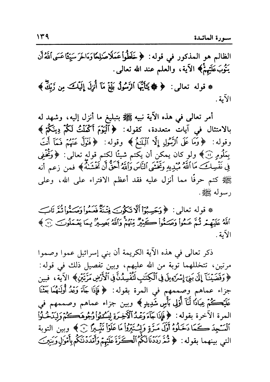 • قوله تعالى: {وَحَسِبُوا أَلَّا تَكُونَ فِتْنَةٌ فَعَمُوا وَصَمُّوا ثُمَّ تَابَ اللَّهُ عَلَيْهِمْ ثُمَّ عَمُوا وَصَمُّوا كَثِيرٌ مِنْهُمْ وَاللَّهُ بَصِيرٌ بِمَا يَعْمَلُونَ (٧١)} الآية.