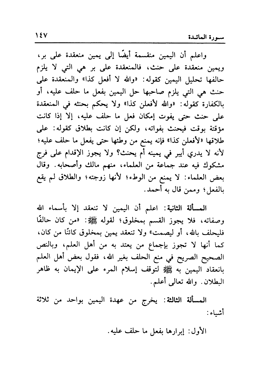 واعلم أن اليمين منقسمة أيضاً إلى يمين منعقدة على بر، ويمين منعقدة على حنث، فالمنعقدة على بر هي التي لا يلزم حالفها تحليل اليمين كقوله: "والله لا أفعل كذا" والمنعقدة على حنث هي التي يلزم صاحبها حل اليمين بفعل ما حلف عليه، أو بالكفارة كقوله: "والله لأفعلن كذا" ولا يحكم بحنثه في المنعقدة على حنث حتى يفوت إمكان فعل ما حلف عليه، إلا إذا كانت مؤقتة بوقت فيحنث بفواته، ولكن إن كانت بطلاق كقوله: على طلاقها "لأفعلن كذا" فإنه يمنع من وطئها حتى يفعل ما حلف عليه؛ لأنه لا يدري أيبر في يمينه أم يحنث؟ ولا يجوز الإقدام على فرج مشكوك فيه عند جماعة من العلماء، منهم مالك وأصحابه. وقال بعض العلماء: لا يمنع من الوطء؛ لأنها زوجته؛ والطلاق لم يقع بالفعل؛ وممن قال به أحمد.