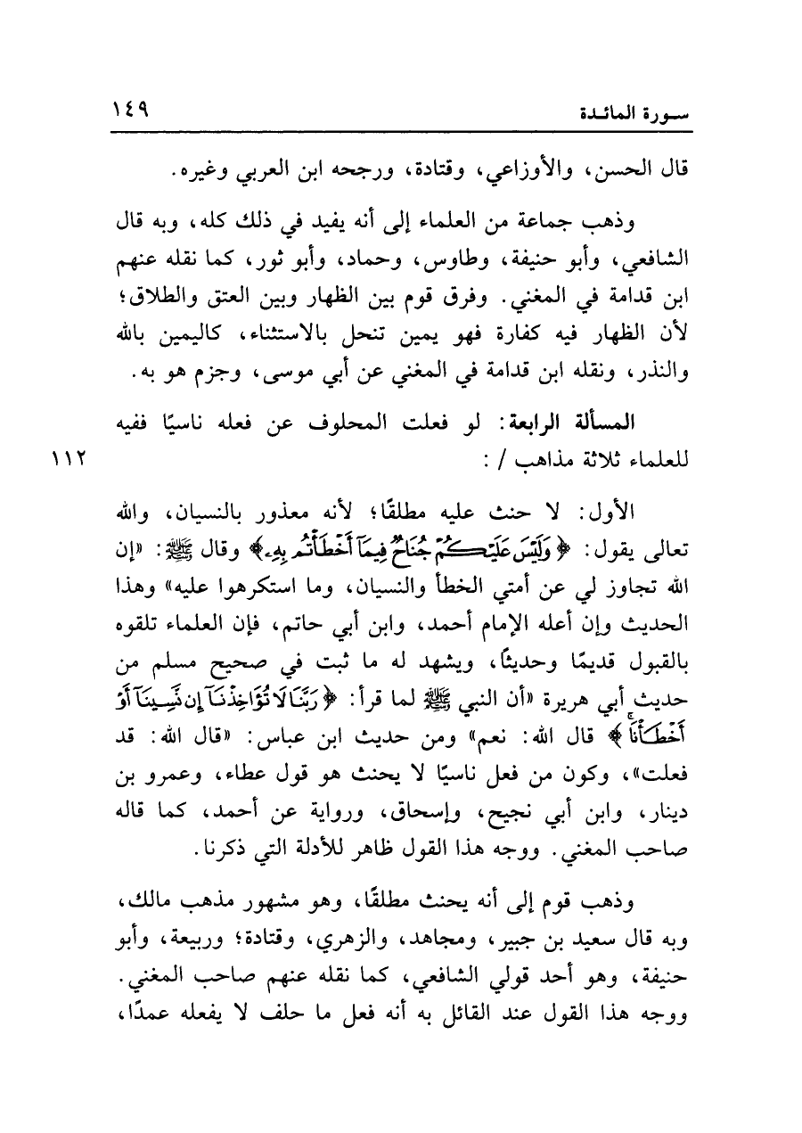 المسألة الرابعة: لو فعلت المحلوف عن فعله ناسياً ففيه للعلماء ثلاثة مذاهب: