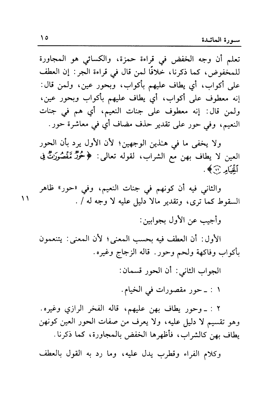 ٢: - وحور يطاف بهن عليهم، قاله الفخر الرازي وغيره. وهو تقسيم لا دليل عليه، ولا يعرف من صفات الحور العين كونهن يطاف بهن كالشراب، فأظهرها الخفض بالمجاورة، كما ذكرنا.