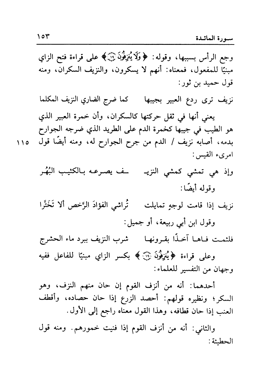 وجع الرأس بسببها، وقوله: {وَلَا يٌنْزَفُونَ (١٩)} على قراءة فتح الزاي مبنياً للمفعول، فمعناه: أنهم لا يسكرون، والنزيف السكران، ومنه قول حميد بن ثور: