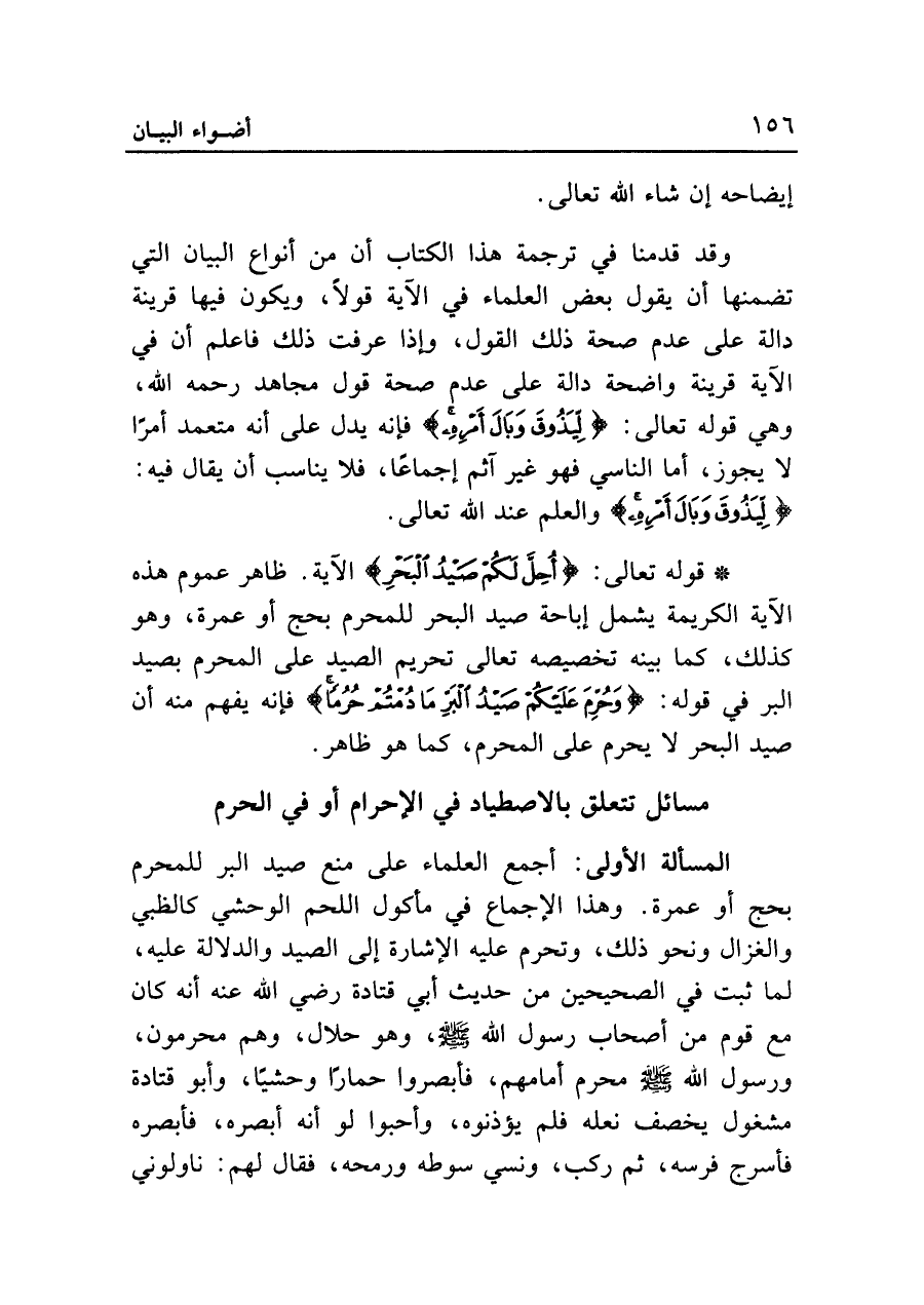 • قوله تعالى: {أُحِلَّ لَكُمْ صَيْدُ الْبَحْرِ} الآية. ظاهر عموم هذه الآية الكريمة يشمل إباحة صيد البحر للمحرم بحج أو عمرة، وهو كذلك، كما بينه تخصيصه تعالى تحريم الصيد على المحرم بصيد البر في قوله: {وَحُرِّمَ عَلَيْكُمْ صَيْدُ الْبَرِّ مَا دُمْتُمْ حُرُماً} فإنه يفهم منه أن صيد البحر لا يحرم على المحرم، كما هو ظاهر.