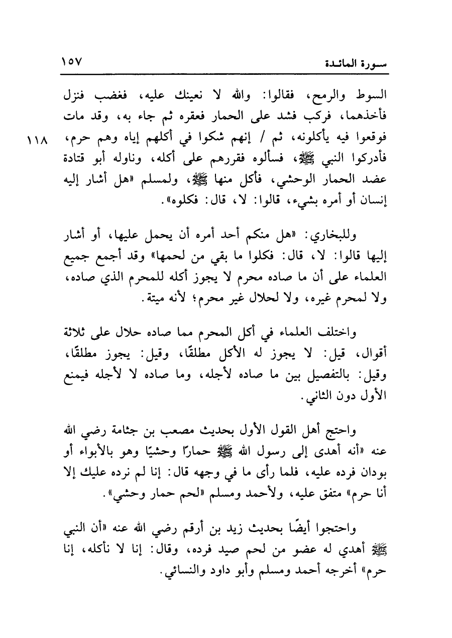 واحتج أهل القول الأول بحديث مصعب بن جثامة رضي الله عنه "أنه أهدي إلى رسول الله - صلى الله عليه وسلم - حماراً وحشياً وهو بالأبواء أو بودان فرده عليه، فلما رأى ما في وجهه قال: إنا لم نرده عليك إلا أنا حرم" متفق عليه، ولأحمد ومسلم "لحم حمار وحشي".