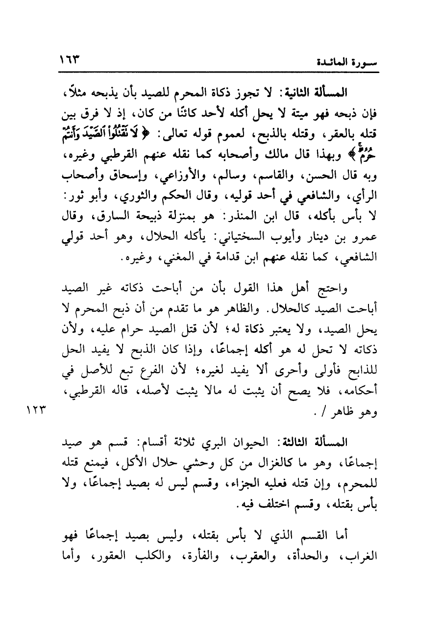 المسألة الثانية: لا تجوز ذكاة المحرم للصيد بأن يذبحه مثلاً، فإن ذبحه فهو ميتة لا يحل أكله لأحد كائناً من كان، إذ لا فرق بين قتله بالعقر، وقتله بالذبح، لعموم قوله تعالى: {لا تَقْتُلُوا الصَّيْدَ وَأَنْتُمْ حُرُمٌ} وبهذا قال مالك وأصحابه كما نقله عنهم القرطبي وغيره، وبه قال الحسن، والقاسم، وسالم، والأوزاعي، وإسحاق وأصحاب الرأي، والشافعي في أحد قوليه، وقال الحكم والثوري، وأبو ثور: لا بأس بأكله، قال ابن المنذر: هو بمنزلة ذبيحة السارق، وقال عمرو بن دينار وأيوب السختياني: يأكله الحلال، وهو أحد قولي الشافعي، كما نقله عنهم ابن قدامة في المغني، وغيره.