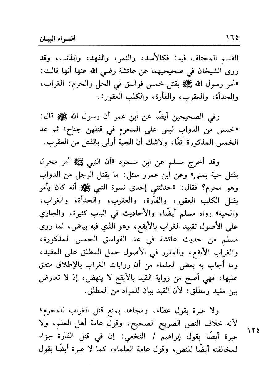 ولا عبرة بقول عطاء، ومجاهد بمنع قتل الغراب للمحرم؛ لأنه خلاف النص الصريح الصحيح، وقول عامة أهل العلم، ولا عبرة أيضاً بقول إبراهيم النخعي: إن في قتل الفأرة جزاء لمخالفته أيضاً للنص، وقول عامة العلماء، كما لا عبرة أيضاً بقول
