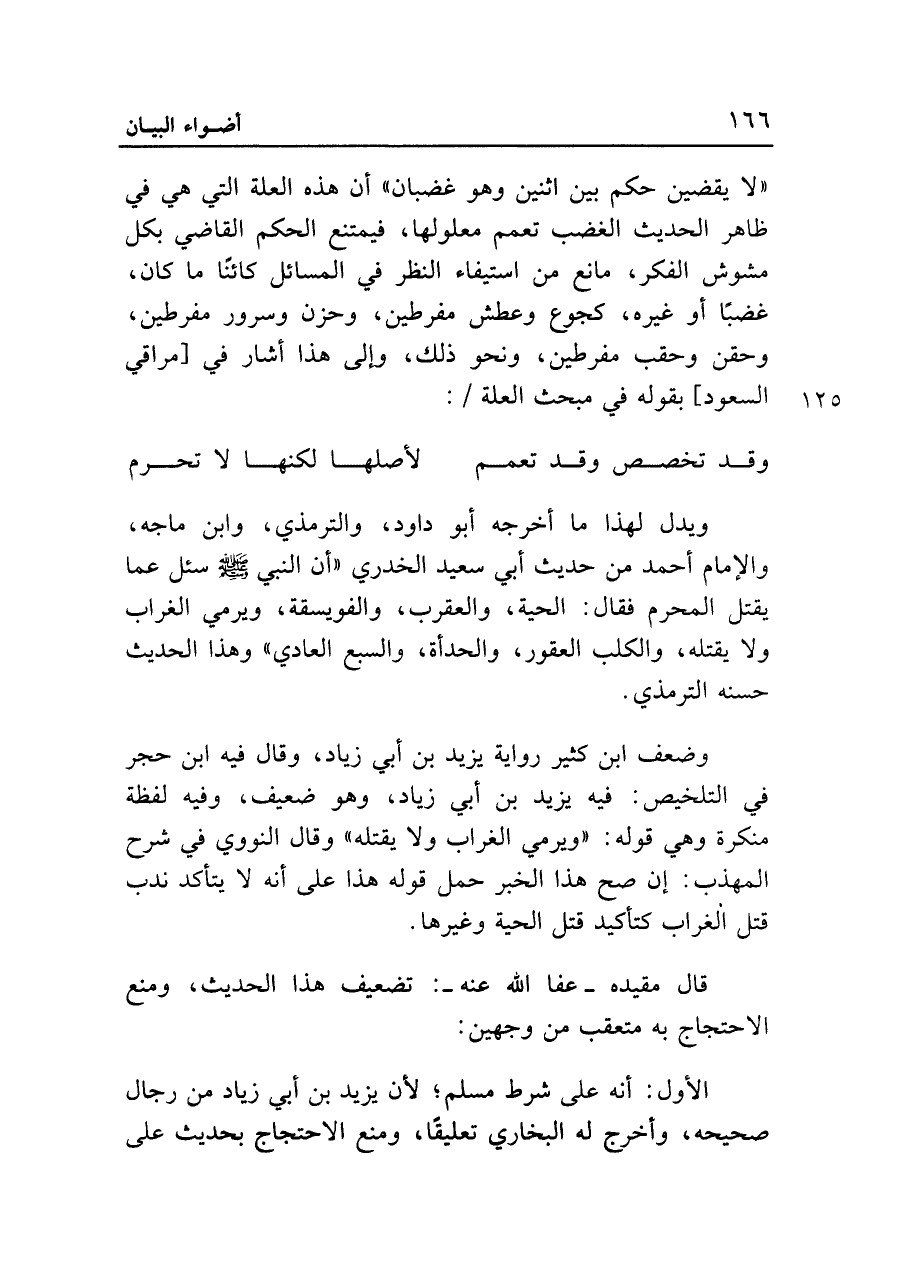 "لا يقضين حكم بين اثنين وهو غضبان" أن هذه العلة التي هي في ظاهر الحديث الغضب تعمم معلولها، فيمتنع الحكم القاضي بكل مشوش الفكر، مانع من استيفاء النظر في المسائل كائناً ما كان، غضباً أو غيره، كجوع وعطش مفرطين، وحزن وسرور مفرطين، وحقن وحقب مفرطين، ونحو ذلك، وإلى هذا أشار في [مراقي السعود] بقوله في مبحث العلة: